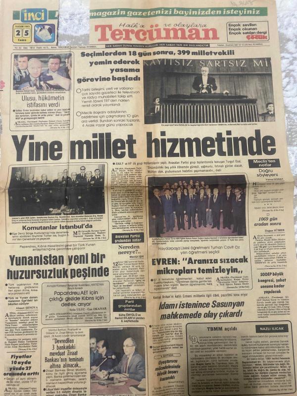 TERCÜMAN GAZETESİ - DOĞUM GÜNÜ HEDİYESİ (TURKISH NEWSPAPPER) - 25 KASIM 1983 - SADECE TEK YAPRAKTIR -Turgut Özal-Kenan Evren-Necdet Uğur-Nurettin Ersin-Ahmet Kabaklı-Rauf Tamer-Mehmet Emre-Mehmet Işık-Ahmet Şenova-Sıtkı Uluç-Onur Okanar-Kemal Arıkan-Nazlı Ilıcak-Vedat Zeydanlı-Yine millet hizmetinde-Seçimlerden 18 gün sonra 399 milletvekili yemin ederek yasama görevine başladı-Kayıtsız şartsız milletindir-Komutanlar İstanbul’da-Yunanistan yeni bir huzursuzluk peşinde-Papandreu AET için çıktığı gezide Kıbrıs için destek arıyor-Devredilen 3 bankadaki mevduat Ziraat Bankası’nın teminatı altına alınacak-Anavatan Partisi grubundan notlar-Evren Aranıza sızacak mikropları temizleyin-İdamı istenince Sasunyan mahkemede olay çıkardı-TBMM açıldı-Gün Işığında Demokrasinin Yeminleri-Ashab-ı Kiram’ın fazileti-Tavşana kaç tazıya tut-Türk Milliyetçileri-Çalışma Bakanlığı’nın örnek çalışması-Hava Durumu-Türkiye Yedi Kardeş Yedi Gelin-Demokrasi’nin Yeminleri-Meclis’ten notlar-Doğru söyleyeni-1069 gün ar adlı eser, Kitap > Süreli Yayınlar > Gazeteler > Türkiye > Genel > Günlük kategorisinde İkinci El olarak satıştadır.