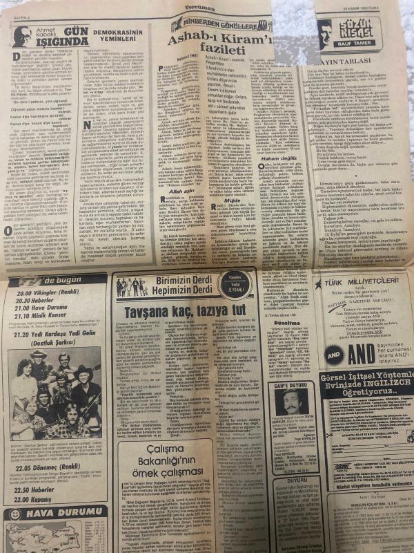 TERCÜMAN GAZETESİ - DOĞUM GÜNÜ HEDİYESİ (TURKISH NEWSPAPPER) - 25 KASIM 1983 - SADECE TEK YAPRAKTIR -Turgut Özal-Kenan Evren-Necdet Uğur-Nurettin Ersin-Ahmet Kabaklı-Rauf Tamer-Mehmet Emre-Mehmet Işık-Ahmet Şenova-Sıtkı Uluç-Onur Okanar-Kemal Arıkan-Nazlı Ilıcak-Vedat Zeydanlı-Yine millet hizmetinde-Seçimlerden 18 gün sonra 399 milletvekili yemin ederek yasama görevine başladı-Kayıtsız şartsız milletindir-Komutanlar İstanbul’da-Yunanistan yeni bir huzursuzluk peşinde-Papandreu AET için çıktığı gezide Kıbrıs için destek arıyor-Devredilen 3 bankadaki mevduat Ziraat Bankası’nın teminatı altına alınacak-Anavatan Partisi grubundan notlar-Evren Aranıza sızacak mikropları temizleyin-İdamı istenince Sasunyan mahkemede olay çıkardı-TBMM açıldı-Gün Işığında Demokrasinin Yeminleri-Ashab-ı Kiram’ın fazileti-Tavşana kaç tazıya tut-Türk Milliyetçileri-Çalışma Bakanlığı’nın örnek çalışması-Hava Durumu-Türkiye Yedi Kardeş Yedi Gelin-Demokrasi’nin Yeminleri-Meclis’ten notlar-Doğru söyleyeni-1069 gün ar, Kemal ılıcak tarafından kaleme alınmıştır. TERCÜMAN GAZETESİ - DOĞUM GÜNÜ HEDİYESİ (TURKISH NEWSPAPPER) - 25 KASIM 1983 - SADECE TEK YAPRAKTIR -Turgut Özal-Kenan Evren-Necdet Uğur-Nurettin Ersin-Ahmet Kabaklı-Rauf Tamer-Mehmet Emre-Mehmet Işık-Ahmet Şenova-Sıtkı Uluç-Onur Okanar-Kemal Arıkan-Nazlı Ilıcak-Vedat Zeydanlı-Yine millet hizmetinde-Seçimlerden 18 gün sonra 399 milletvekili yemin ederek yasama görevine başladı-Kayıtsız şartsız milletindir-Komutanlar İstanbul’da-Yunanistan yeni bir huzursuzluk peşinde-Papandreu AET için çıktığı gezide Kıbrıs için destek arıyor-Devredilen 3 bankadaki mevduat Ziraat Bankası’nın teminatı altına alınacak-Anavatan Partisi grubundan notlar-Evren Aranıza sızacak mikropları temizleyin-İdamı istenince Sasunyan mahkemede olay çıkardı-TBMM açıldı-Gün Işığında Demokrasinin Yeminleri-Ashab-ı Kiram’ın fazileti-Tavşana kaç tazıya tut-Türk Milliyetçileri-Çalışma Bakanlığı’nın örnek çalışması-Hava Durumu-Türkiye Yedi Kardeş Yedi Gelin-Demokrasi’nin Yeminleri-Meclis’ten notlar-Doğru söyleyeni-1069 gün ar adlı eser Türkçe dilindedir.