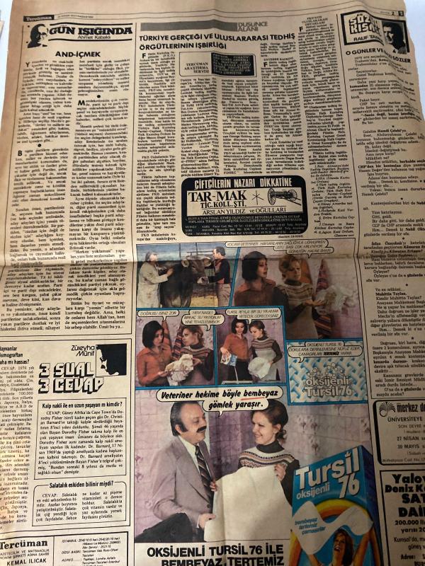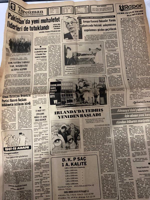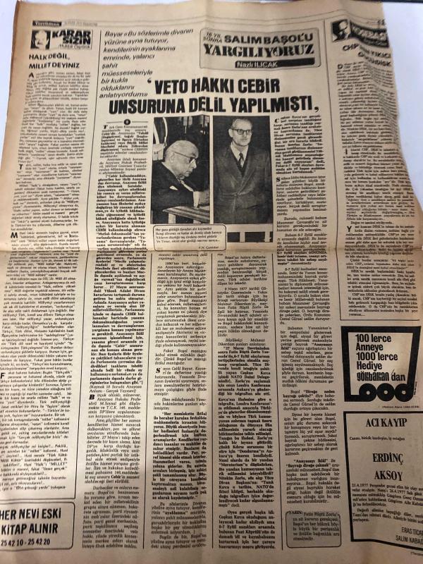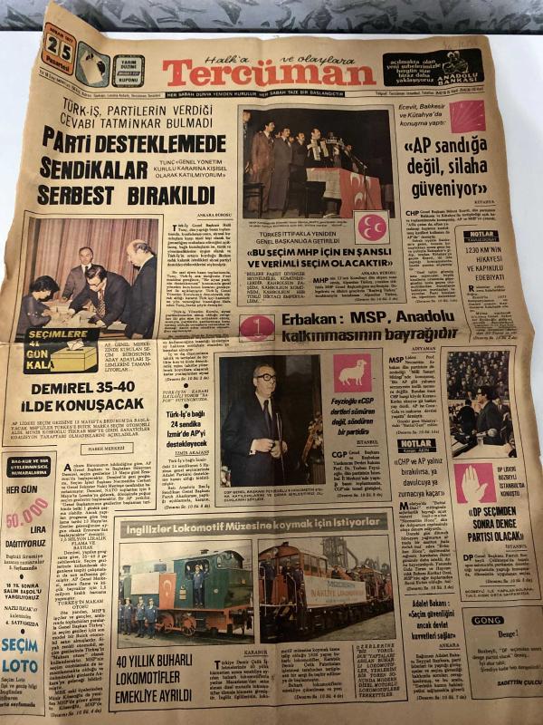 TERCÜMAN GAZETESİ - DOĞUM GÜNÜ HEDİYESİ (TURKISH NEWSPAPPER) - 25 NİSAN 1977 - SADECE DÖRT SAYFADIR -Bülent Ecevit-Necmettin Erbakan-Alparslan Türkeş-Süleyman Demirel-Sadi Irmak-Ahmet Kabaklı-Rauf Tamer-Nazlı Ilıcak-Sadettin Çulcu-F N Fafik Camlibel-PARTİ DESTEKLİ EMEDE SENDİKALAR SERBEST BIRAKILDI-AP SANDIĞA DEĞİL SİLAHA GÜVENİYOR-BU SEÇİM MHP İÇİN EN ŞANSLI VE VERİMLİ SEÇİM OLACAKTIR-MSP ANADOLU KALKINMASININ BAYRAĞIDIR-DEMİREL 35 40 İLDE KONUŞACAK-40 YILLIK BUHARLI LOKOMOTİFLER EMEKLİYE AYRILDI-TÜRKİYE GERÇEĞİ VE ULUSLARARASI TEDHİŞ ÖRGÜTLERİNİN İŞBİRLİĞİ-PAKİSTAN DA YENİ MUHALEFET LİDERLERİ DE TUTUKLANDI-İRLANDA DA TEDHİŞ YENİDEN BAŞLADI-VETO HAKKI CEBİR UNSURUNA DELİL YAPILMIŞTI-16 YIL SONRA SALİM BAŞOLU YARGILIYORUZ-HALK DEĞİL MİLLET DEYİNİZ adlı eser, Kitap > Süreli Yayınlar > Gazeteler > Türkiye > Genel > Günlük kategorisinde İkinci El olarak satıştadır.
