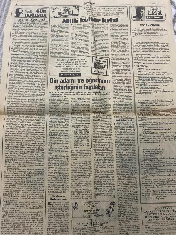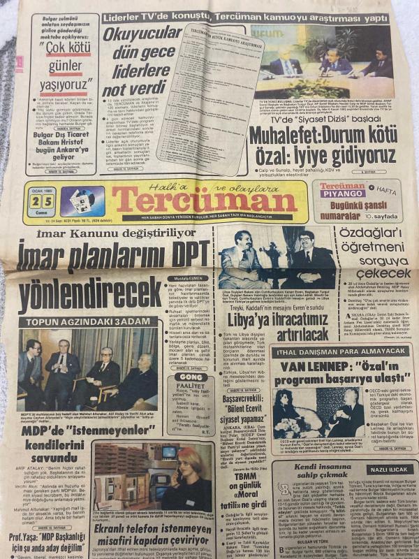 TERCÜMAN GAZETESİ - DOĞUM GÜNÜ HEDİYESİ (TURKISH NEWSPAPPER) - 25 OCAK 1985 - SADECE TEK YAPRAKTIR -Turgut Özal-Kenan Evren-Kaddafi-Bülent Ecevit-Turgut Sunalp-Hristof-Ahmet Kabaklı-Hamdi Mert-Rauf Tamer-Mehmed Emre-Serpil Yılmaz-Hüseyin Yılmaz-İmar planlarını DPT yönlendirecek-Muhalefet Durum kötü Özal İyiye gidiyoruz-Libya’ya ihracatımız artırılacak-Özdağlar’ı öğretmeni sorguya çekecek-Van Lennep Özal’ın programı başarıya ulaştı-MDP’de İstenmeyenler kendilerini savundu-Ekranlı telefon istenmeyen misafiri kapıdan çeviriyor-Din adamı ve öğretmen işbirliğinin faydaları-Milli kültür krizi-Şeytan Çemberi-Gün Işığında-Pijama Sohbeti-Sütun Kısalt-İmar Kanunu değiştiriliyor-Liderler TV’de konuştu Tercüman kamuoyu araştırması yaptı-Okuyucular dün gece liderlere not verdi-Tercüman Piyango-Bugünkü şanslı numaralar-Topun ağzındaki 3 adam-Başsavcılıkla Bülent Ecevit siyaset yapamaz-TBMM on günlük moral tatiline girdi-Gong faaliyet-Nazlı Ilıcak-Sümerbank Çanakkale Sentetik Fabrikası Müdürü-İlan Tu, Kemal ılıcak tarafından kaleme alınmıştır. TERCÜMAN GAZETESİ - DOĞUM GÜNÜ HEDİYESİ (TURKISH NEWSPAPPER) - 25 OCAK 1985 - SADECE TEK YAPRAKTIR -Turgut Özal-Kenan Evren-Kaddafi-Bülent Ecevit-Turgut Sunalp-Hristof-Ahmet Kabaklı-Hamdi Mert-Rauf Tamer-Mehmed Emre-Serpil Yılmaz-Hüseyin Yılmaz-İmar planlarını DPT yönlendirecek-Muhalefet Durum kötü Özal İyiye gidiyoruz-Libya’ya ihracatımız artırılacak-Özdağlar’ı öğretmeni sorguya çekecek-Van Lennep Özal’ın programı başarıya ulaştı-MDP’de İstenmeyenler kendilerini savundu-Ekranlı telefon istenmeyen misafiri kapıdan çeviriyor-Din adamı ve öğretmen işbirliğinin faydaları-Milli kültür krizi-Şeytan Çemberi-Gün Işığında-Pijama Sohbeti-Sütun Kısalt-İmar Kanunu değiştiriliyor-Liderler TV’de konuştu Tercüman kamuoyu araştırması yaptı-Okuyucular dün gece liderlere not verdi-Tercüman Piyango-Bugünkü şanslı numaralar-Topun ağzındaki 3 adam-Başsavcılıkla Bülent Ecevit siyaset yapamaz-TBMM on günlük moral tatiline girdi-Gong faaliyet-Nazlı Ilıcak-Sümerbank Çanakkale Sentetik Fabrikası Müdürü-İlan Tu adlı eser Türkçe dilindedir.