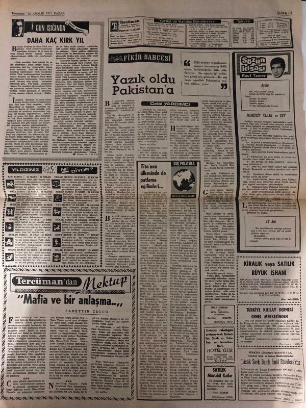TERCÜMAN GAZETESİ - DOĞUM GÜNÜ HEDİYESİ (TURKISH NEWSPAPPER) - 26 ARALIK 1971 - SADECE TEK YAPRAKTIR -Kemal Ilıcak-Celal Yardımcı-Rauf Tamer-Saadettin Çulcu-Memur maaşında yine kısıntı olacak-Mali Denge Vergisi ile maaşlardan 350 liraya kadar kısıntı yapılacak-Erim Kıbrıs için 5li toplantı hazırlığı var-Atabeyin yeni yıl müjdesi bol su-Rahman Dakkaya dönüyor-Yıldırım düşen evde üç kişi canverdi-15 Ocaktan sonra İstanbul yüzde 50 fazla su verilecek-İstanbul semalarında görülen ismin göktaşı olduğu açıklandı-Mafya-Bu kitap Türkiyede kıyametler koparacak-Doğuda soğuklar artınca grip salgın halini aldı-Bitliste dükkanlar dört gün kapalı kaldı-Aynı yerden dereye uçan iki otobüsün sekiz yolcusu öldü-Daha kaç kırk yıl-Yazık oldu Pakistana-Titonun ülkesinde de patlama eğilimleri-Yıldızınız ne diyor-Tercümandan mektup-Mafya ve bir anlaşma-Kiralık veya satılık büyük işhanı-Türkiye Kızılay Derneği genel merkezinden-Türkiye Çimento Sanayii T A Ş Lastik Sevk Bandı İmal Ettirilecektir-Satılık müstak adlı eser Türkçe dilindedir.