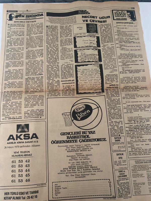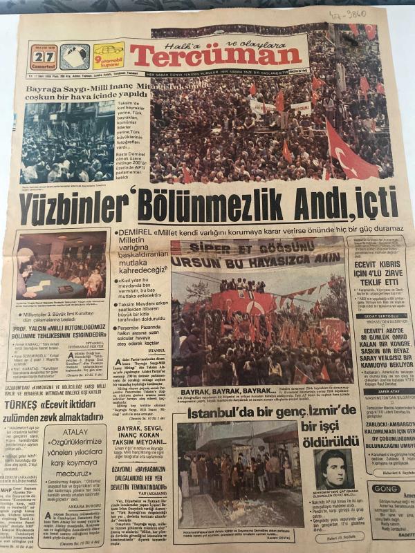TERCÜMAN GAZETESİ - DOĞUM GÜNÜ HEDİYESİ (TURKISH NEWSPAPPER) - 27 MAYIS 1978 - SADECE TEK YAPRAKTIR -Süleyman Demirel-Bülent Ecevit-Alparslan Türkeş-Yalçın-Atalay-Necdet Uğur-Ali Rıza Alp-Ahmet Kabaklı-Rauf Tamer-Zafer Atay-Levent Çevik-Sedat Sertoğlu-Yüzbinler Bölünmezlik Andı İçti-Bayrağa Saygı Milli İnanç Mitingi coşkun bir hava içinde yapıldı-Demirel Millet kendi varlığını korumaya karar verirse önünde hiçbir güç duramaz-Prof Yalçın Milli bütünlüğümüz bölünme tehlikesi içindedir-Türkeş Ecevit iktidarı zulümden zevk almaktadır-Atalay Özgürlüklerimize yönelen yıkıcılara karşı koymaya mecburuz-Bayrak Sevgi İnanç kokan Taksim Meydanı-Özaydınlı Bayrağımızın dalgalandığı her yer devletin teminatındadır-İstanbulda bir genç İzmirde bir işçi öldürüldü-Ecevit Kıbrıs için 4lü zirve teklif etti-Ecevit ABDde 80 günlük ömrü kalan bir kongre şaşkın bir Beyaz Saray ilgisiz bir kamuoyu bekliyor-Zablocki ambargosunun kaldırılması için oy çoğunluğunun bulunacağını umuyoruz-Gün Işığında Zincirli Devri, Kemal ılıcak tarafından kaleme alınmıştır. TERCÜMAN GAZETESİ - DOĞUM GÜNÜ HEDİYESİ (TURKISH NEWSPAPPER) - 27 MAYIS 1978 - SADECE TEK YAPRAKTIR -Süleyman Demirel-Bülent Ecevit-Alparslan Türkeş-Yalçın-Atalay-Necdet Uğur-Ali Rıza Alp-Ahmet Kabaklı-Rauf Tamer-Zafer Atay-Levent Çevik-Sedat Sertoğlu-Yüzbinler Bölünmezlik Andı İçti-Bayrağa Saygı Milli İnanç Mitingi coşkun bir hava içinde yapıldı-Demirel Millet kendi varlığını korumaya karar verirse önünde hiçbir güç duramaz-Prof Yalçın Milli bütünlüğümüz bölünme tehlikesi içindedir-Türkeş Ecevit iktidarı zulümden zevk almaktadır-Atalay Özgürlüklerimize yönelen yıkıcılara karşı koymaya mecburuz-Bayrak Sevgi İnanç kokan Taksim Meydanı-Özaydınlı Bayrağımızın dalgalandığı her yer devletin teminatındadır-İstanbulda bir genç İzmirde bir işçi öldürüldü-Ecevit Kıbrıs için 4lü zirve teklif etti-Ecevit ABDde 80 günlük ömrü kalan bir kongre şaşkın bir Beyaz Saray ilgisiz bir kamuoyu bekliyor-Zablocki ambargosunun kaldırılması için oy çoğunluğunun bulunacağını umuyoruz-Gün Işığında Zincirli Devri adlı eser Türkçe dilindedir.