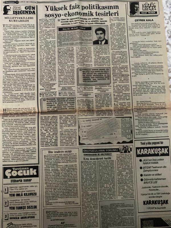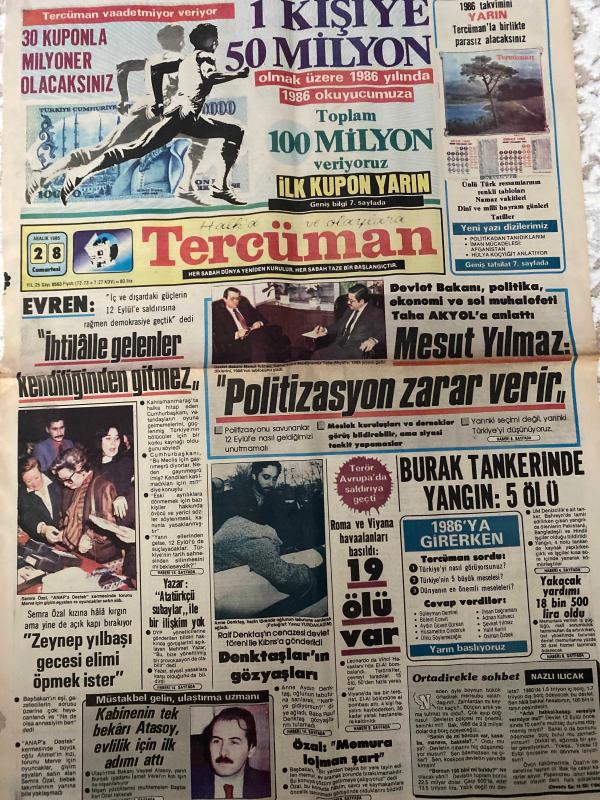 TERCÜMAN GAZETESİ - DOĞUM GÜNÜ HEDİYESİ (TURKISH NEWSPAPPER) - 28 ARALIK 1985 - SADECE TEK YAPRAKTIR-Kenan Evren-Mesut Yılmaz-Taha Akyol-Semra Özal-Zeynep Atasoy-Veysel Atasoy-Rauf Tamer-Ahmet Kabaklı-Rauf Denktaş-Nazlı Ilıcak-Süleyman Demirel-İhsan Doğramacı-Adnan Kahveci-Şevket Yılmaz-Hüsamettin Cindoruk-Ülkü Süleymanoğlu-Leonardo da Vinci-Doç Dr N Zeki Uluslu-İrfan Kaya Ülger-Nakayama-Bruce Lee-EVREN İhtilalle gelenler kendiliğinden gitmez-Politizasyon zarar verir-BURAK TANKERİNDE YANGIN 5 ÖLÜ-1986’ya girerken-Yüksek faiz politikasının sosyo ekonomik tesirleri-Avrupa’da saldırıya geçtiler 19 ölü var-Denktaşların gözyaşları-Zeynep yılbaşı gecesi elimi öpmek ister-Kabinenin tek bekar Atasoy evlilik için ilk adımı attı-Özal Memura bin artı-Hür iradeye saygı-Okuyucuların Forumu Demokrasiden ne anlıyoruz-Kısa demokrasi tarihi-Yeni yılda yepyeni bir Karakuşak-30 kuponla milyoner olacaksınız-1 kişiye 50 milyon-Toplam 100 milyon veriyoruz-İlk kupon yarın-Sözün Kısası-Gün Işığında-Milletvek adlı eser Türkçe dilindedir.