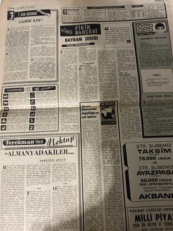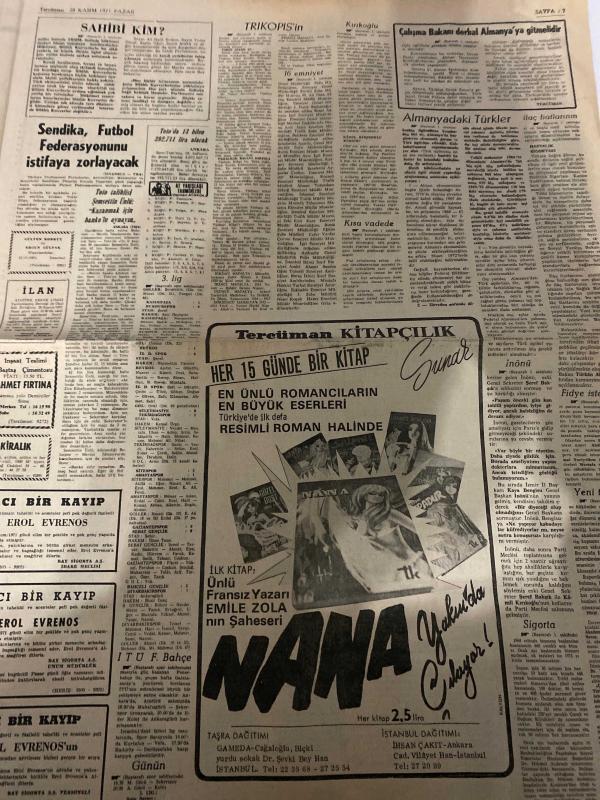 TERCÜMAN GAZETESİ - DOĞUM GÜNÜ HEDİYESİ (TURKISH NEWSPAPPER) - 28 KASIM 1971 - SADECE DÖRT SAYFADIR -Kemal Ilıcak-Kamil Kırıkoğlu-Celal Yardımcı-Rauf Tamer-Sadettin Çulcu-Emile Zola-Ergun-Hikmet Aydemir-Necip Kapanlı-Ender Coşkun-Oeal Uluc-Aydın İrgen-Almanyadaki Türkler için endişeye yer yok-Kırıkoğlu CHPye genel sekreter oldu-Ateşli silahların savaşında alınan madalyalar iktisadi savaşta elden çıkarılıyor-Trikopisin 7 madalyası satılıyor-16 emniyet müdür ve muavini daha yer değiştirdi-İlaç fiyatlarının ucuzlatılması kararlaştırıldı-80 milyonluk ve 1160 yataklı hastanenin ilk kısmı ocakta açılıyor-Sahibi kim-Fikir bahçesi bayram şekeri-Sözün kısası Amerikan sigarası-Tercümandan mektup Almanyadakiler-Sendika futbol federasyonunu istifaya zorlayacak-Tercüman kitapçılık her 15 günde bir kitap en ünlü romancıların en büyük eserleri resimli roman halinde Nana-Birinci Türkiye ligi ringinde 7 kavga-Vefa G Saraydan puan kopardı 0 0-Adana Demirspor Sivasi boş yolladı 1 0-Konya İdman yurdu Fer adlı eser, Kitap > Süreli Yayınlar > Gazeteler > Türkiye > Genel > Günlük kategorisinde İkinci El olarak satıştadır.