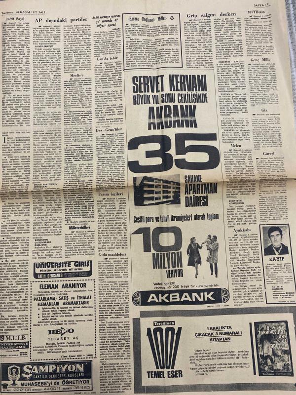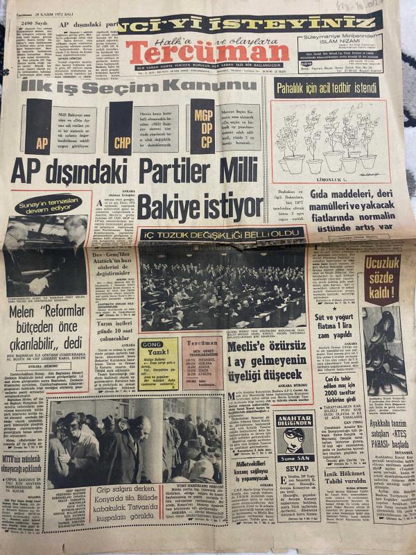 TERCÜMAN GAZETESİ - DOĞUM GÜNÜ HEDİYESİ (TURKISH NEWSPAPPER) - 28 KASIM 1972 - SADECE DÖRT SAYFADIR -Suna San-Rauf Tamer-Salih Binay-Turgan Ece-Cankurtaran-Ece-Adil Candemir-Ali Gümüş-Mahmut Küçük-Ahmet Şahin-Kadir Geçici-Dev maçın TV’den nakli isteniyor-F Bahçe G Saray hazırlığı başladı-Genç milli takım yarın Tiflis’e gidiyor-Giz Kayserispor’a antrenör oluyor-Kadir Geçici memnun etti-Adil Candemir kurtuluş çaresi gösterdi güreşi bütün yurtta aramalı-Feriköy Sivas-Lig dev bir maçla açılıyor-Büyük oyun büyük skor-Darısı milli takımın başına-Haftanın adamı Cana-Şeker Mersin-PTT Göztepe-F Bahçe Bursa-Altay Vefa-Giresun A Gücü-Adanaspor Beşiktaş-Samsun Bolu-AP dışındaki partiler milli bakiye istiyor-İlk iş seçim kanunu-Pahalılık için acil tedbir istendi-Gıda maddeleri deri mamulleri ve yakacak fiyatlarında normalin üstünde artış var-Süt ve yoğurt fiyatına 1 lira zam yapıldı-Ucuzluk sözde kaldı-Meclise özürsüz 1 ay gelmeyenin üyeliği düşecek-Devalüasyondan sonra yeni tedbirler alındı-Yenica, Kemal ılıcak tarafından kaleme alınmıştır. TERCÜMAN GAZETESİ - DOĞUM GÜNÜ HEDİYESİ (TURKISH NEWSPAPPER) - 28 KASIM 1972 - SADECE DÖRT SAYFADIR -Suna San-Rauf Tamer-Salih Binay-Turgan Ece-Cankurtaran-Ece-Adil Candemir-Ali Gümüş-Mahmut Küçük-Ahmet Şahin-Kadir Geçici-Dev maçın TV’den nakli isteniyor-F Bahçe G Saray hazırlığı başladı-Genç milli takım yarın Tiflis’e gidiyor-Giz Kayserispor’a antrenör oluyor-Kadir Geçici memnun etti-Adil Candemir kurtuluş çaresi gösterdi güreşi bütün yurtta aramalı-Feriköy Sivas-Lig dev bir maçla açılıyor-Büyük oyun büyük skor-Darısı milli takımın başına-Haftanın adamı Cana-Şeker Mersin-PTT Göztepe-F Bahçe Bursa-Altay Vefa-Giresun A Gücü-Adanaspor Beşiktaş-Samsun Bolu-AP dışındaki partiler milli bakiye istiyor-İlk iş seçim kanunu-Pahalılık için acil tedbir istendi-Gıda maddeleri deri mamulleri ve yakacak fiyatlarında normalin üstünde artış var-Süt ve yoğurt fiyatına 1 lira zam yapıldı-Ucuzluk sözde kaldı-Meclise özürsüz 1 ay gelmeyenin üyeliği düşecek-Devalüasyondan sonra yeni tedbirler alındı-Yenica adlı eser Türkçe dilindedir.