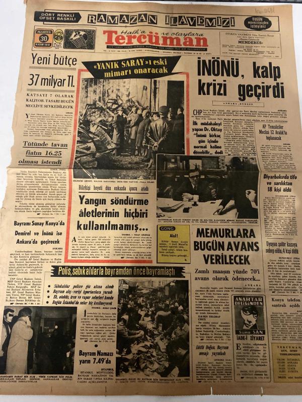 TERCÜMAN GAZETESİ - DOĞUM GÜNÜ HEDİYESİ (TURKISH NEWSPAPPER) - 30 KASIM 1970 - SADECE TEK YAPRAKTIR -İnönü-Dr.Oktay-Yurdat Gül-Lütfi Doğan-Ali Naili Erdem-Rauf Tamer-Suna San-D.Wright-Yeni bütçe 37 milyar Tl-YANIK SARAYI eski mimarı onaracak-İNÖNÜ kalp krizi geçirdi-Tütünde tavan fiyatın 16.25 olması istendi-Bayramı Sunay Konyada-Demirel ve İnönü ise Ankarada geçirecek-Yangın söndürme aletlerinin hiçbiri kullanılmamış-Polis sabıkalılarla bayramdan önce bayramlaştı-Memurlara bugün avans verilecek-Zamlı maaşın yüzde 70i avans olarak ödenecek-Bayram Namazı yarın 7.49da-Halktan Kopmuş Fikirler-Ben Paristeyken-3 sual 3 cevap-Saadet Rüyası-Bob Sawyerin Maceraları-Lübnan İsrailin aynı barış teklifini reddetti-Fen Bilimleri Hazırlık Kursu-Fen Bilimleri Kurumu-Kurumumuzun hiç bir yerde şubesi yoktur-Gerçek bir arama içinde miyiz yoksa Devleti batırmak mı istiyoruz-Özenti Budalaları-Kendimizi Tanıyalım-İdeoloji ve Ekonomi-Gün Işığında-Minhal Bakanlık-Yıldızınız ne diyor-Anahtar Deliğinden-Akıl-G adlı eser, Kitap > Süreli Yayınlar > Gazeteler > Türkiye > Genel > Günlük kategorisinde İkinci El olarak satıştadır.