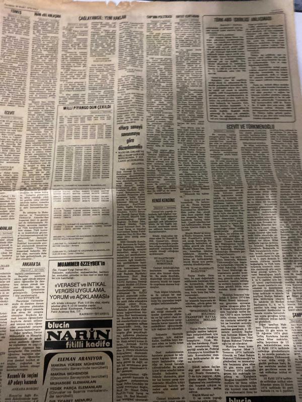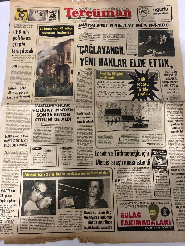 TERCÜMAN GAZETESİ - DOĞUM GÜNÜ HEDİYESİ (TURKISH NEWSPAPPER) - 30 MART 1976 - SADECE DÖRT SAYFADIR -Melih Esen-Çağlayangil-Ecevit-Türkmenoğlu-Ahmet Kabaklı-Jacques Mornand-Rauf Tamer-Kemal Ilıcak-Güven Taner-Atilla Gökçe-Kemal Belgin-Cihat Yenidoğan-Vehbi Emre-Mehmet Akdağ-Mehmet Yalçın-CHPnin politikası grupta tartışılacak-Lübnanda Oteller Savaşı hızlandı-Dışişleri Bakanı dün döndü-Çağlayangil yeni haklar elde ettik-İngiliz bilgini açıkladı-İlk robotu Türkler yaptı-Müslümanlar Holiday Innden sonra Hilton Otelini de aldı-Batman solcular üniversiteye sahte belgelerle giriyor-Murat için 3 milletin ordusu seferber oldu-Hayat kurtaran ilaç Almanyada bulunup süratle getirilince küçük hasta kurtuldu-Ecevit ve Türkmenoğlu için Meclis araştırması istendi-Gulag Takımadalar yarın başlıyoruz-Sovyetler Birliği bağımsız mı-Çözülen buzlar-Fruko daha güzel-Şok nedir-Hormon tedavisi safra kesini bozar mı-Yıldızınız ne diyor-Türkiyedeki tüm sigortalılara ayda 1000 lira taksitle-Maden mühendisleri aran, Kemal Ilıcak tarafından kaleme alınmıştır. TERCÜMAN GAZETESİ - DOĞUM GÜNÜ HEDİYESİ (TURKISH NEWSPAPPER) - 30 MART 1976 - SADECE DÖRT SAYFADIR -Melih Esen-Çağlayangil-Ecevit-Türkmenoğlu-Ahmet Kabaklı-Jacques Mornand-Rauf Tamer-Kemal Ilıcak-Güven Taner-Atilla Gökçe-Kemal Belgin-Cihat Yenidoğan-Vehbi Emre-Mehmet Akdağ-Mehmet Yalçın-CHPnin politikası grupta tartışılacak-Lübnanda Oteller Savaşı hızlandı-Dışişleri Bakanı dün döndü-Çağlayangil yeni haklar elde ettik-İngiliz bilgini açıkladı-İlk robotu Türkler yaptı-Müslümanlar Holiday Innden sonra Hilton Otelini de aldı-Batman solcular üniversiteye sahte belgelerle giriyor-Murat için 3 milletin ordusu seferber oldu-Hayat kurtaran ilaç Almanyada bulunup süratle getirilince küçük hasta kurtuldu-Ecevit ve Türkmenoğlu için Meclis araştırması istendi-Gulag Takımadalar yarın başlıyoruz-Sovyetler Birliği bağımsız mı-Çözülen buzlar-Fruko daha güzel-Şok nedir-Hormon tedavisi safra kesini bozar mı-Yıldızınız ne diyor-Türkiyedeki tüm sigortalılara ayda 1000 lira taksitle-Maden mühendisleri aran adlı eser Türkçe dilindedir.
