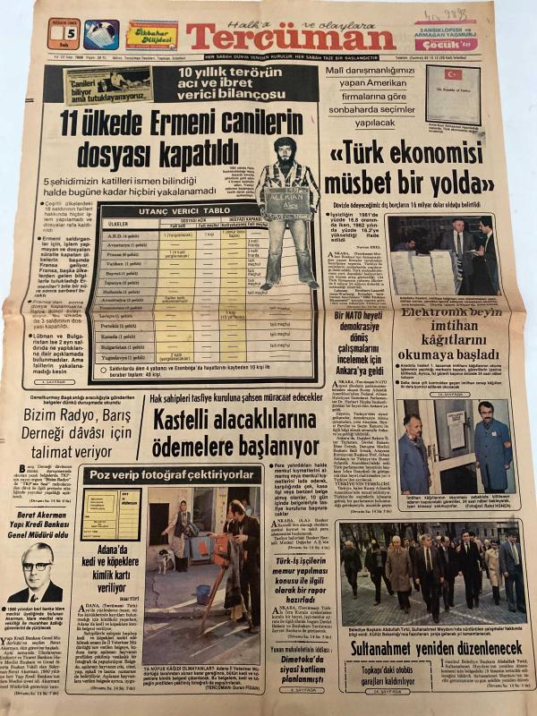TERCÜMAN GAZETESİ - DOĞUM GÜNÜ HEDİYESİ (TURKISH NEWSPAPPER) - 5 NİSAN 1983 - SADECE TEK YAPRAKTIR - Rauf Tamer-Ahmet Kabaklı-İlhan Bardakçı-Berat Akerman-Duran Fidan-Abdullah Tırtıl-11 ülkede Ermeni canilerin dosyası kapatıldı-10 yıllık terörün acı ve ibret verici bilançosu-Türk ekonomisi müsbet bir yolda-Bizim Radyo Barış Derneği davası için talimat veriyor-Kastelli alacaklılarına ödemelere başlanıyor-Poz verip fotoğraf çektiriyorlar-Adanada kedi ve köpeklere kimlik kartı veriliyor-Bir NATO heyeti demokrasiye dönüş çalışmalarını incelemek için Ankaraya geldi-Elektronik beyin imtihan kağıtlarını okuyacak-Sultanahmet yeniden düzenlenecek-Tarihten bugüne-Tehlike çanları-Suç sayılan-Mobil yarım asırdan beri Türk çiftçisinin yanında Türk tarımının hizmetinde】, Kemal ılıcak tarafından kaleme alınmıştır. TERCÜMAN GAZETESİ - DOĞUM GÜNÜ HEDİYESİ (TURKISH NEWSPAPPER) - 5 NİSAN 1983 - SADECE TEK YAPRAKTIR - Rauf Tamer-Ahmet Kabaklı-İlhan Bardakçı-Berat Akerman-Duran Fidan-Abdullah Tırtıl-11 ülkede Ermeni canilerin dosyası kapatıldı-10 yıllık terörün acı ve ibret verici bilançosu-Türk ekonomisi müsbet bir yolda-Bizim Radyo Barış Derneği davası için talimat veriyor-Kastelli alacaklılarına ödemelere başlanıyor-Poz verip fotoğraf çektiriyorlar-Adanada kedi ve köpeklere kimlik kartı veriliyor-Bir NATO heyeti demokrasiye dönüş çalışmalarını incelemek için Ankaraya geldi-Elektronik beyin imtihan kağıtlarını okuyacak-Sultanahmet yeniden düzenlenecek-Tarihten bugüne-Tehlike çanları-Suç sayılan-Mobil yarım asırdan beri Türk çiftçisinin yanında Türk tarımının hizmetinde】 adlı eser Türkçe dilindedir.