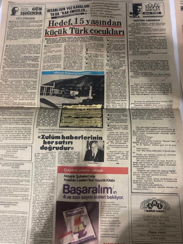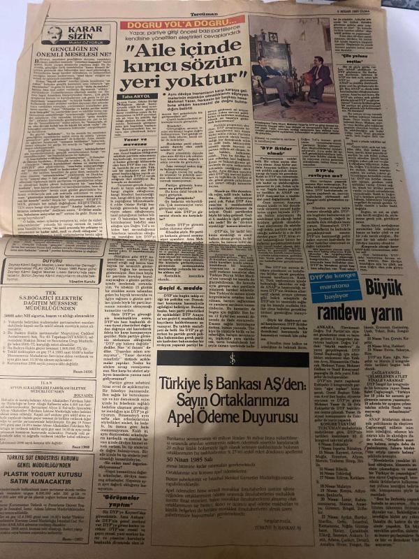 TERCÜMAN GAZETESİ - DOĞUM GÜNÜ HEDİYESİ (TURKISH NEWSPAPPER) - 5 NİSAN 1985 - SADECE DÖRT SAYFADIR -Ahmet Kabaklı-Rauf Tamer-Tokay Gözütok-Altemur Kılıç-Kemal Ertan-Hasan Türkan-Taha Akyol-Muhib Özbayrak-Hükümetin bankalar üzerindeki yetkileri artırıldı-Fiyat artışı yüzde 2.6-Vergi yarışında lider değişti-Ayrı ses ayrı biçim-Faisal Finans Kurumu-Hükümetin bankalar üzerindeki yetkileri artırıldı-Yatırım yapmadan işsizlik önlenemez-Eski ortakların hakkı korunuyor-Döviz kurları-Aile içinde kırıcı sözün yeri yoktur-DYP’de kongre maratonu başlıyor-Büyük randevu yarın-Türkiye İş Bankası AŞ’den Sayın Ortaklarımıza Apel Ödeme Duyurusu-Bunlar insan olamaz-Eşkıya Şırnak’ta sağlık ekibine saldırdı 5 şehit-Balıkesir’de elem verici kaza-Askeri uçak şehre düştü 16 ölü-Atina Barışı reddetti-MİT Bulgar oyununu bozdu-Yazar Büyük Başkan sloganı ile uğurlandı-Hedef 15 yaşından küçük Türk çocuklar-Zulüm haberlerinin her satırı doğrudur-İnsanlığın yüz karaları ya da kan emiciler-Gezinin ardından-Biber daml, Kemal ılıcak tarafından kaleme alınmıştır. TERCÜMAN GAZETESİ - DOĞUM GÜNÜ HEDİYESİ (TURKISH NEWSPAPPER) - 5 NİSAN 1985 - SADECE DÖRT SAYFADIR -Ahmet Kabaklı-Rauf Tamer-Tokay Gözütok-Altemur Kılıç-Kemal Ertan-Hasan Türkan-Taha Akyol-Muhib Özbayrak-Hükümetin bankalar üzerindeki yetkileri artırıldı-Fiyat artışı yüzde 2.6-Vergi yarışında lider değişti-Ayrı ses ayrı biçim-Faisal Finans Kurumu-Hükümetin bankalar üzerindeki yetkileri artırıldı-Yatırım yapmadan işsizlik önlenemez-Eski ortakların hakkı korunuyor-Döviz kurları-Aile içinde kırıcı sözün yeri yoktur-DYP’de kongre maratonu başlıyor-Büyük randevu yarın-Türkiye İş Bankası AŞ’den Sayın Ortaklarımıza Apel Ödeme Duyurusu-Bunlar insan olamaz-Eşkıya Şırnak’ta sağlık ekibine saldırdı 5 şehit-Balıkesir’de elem verici kaza-Askeri uçak şehre düştü 16 ölü-Atina Barışı reddetti-MİT Bulgar oyununu bozdu-Yazar Büyük Başkan sloganı ile uğurlandı-Hedef 15 yaşından küçük Türk çocuklar-Zulüm haberlerinin her satırı doğrudur-İnsanlığın yüz karaları ya da kan emiciler-Gezinin ardından-Biber daml adlı eser Türkçe dilindedir.