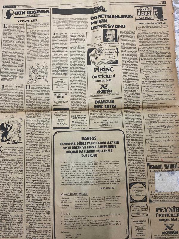 TERCÜMAN GAZETESİ - DOĞUM GÜNÜ HEDİYESİ (TURKISH NEWSPAPPER) - 7 NİSAN 1979 - SADECE TEK YAPRAKTIR -İhsan Sönmez-Carter-Mete Tan-Demirel-Ecevit-Ahmet Kabaklı-Rauf Tamer-Ali Rıza Alp-Musa Bengi-Devallüasyon geliyor-Carter Şimdi çözüm sırası Kıbrıs ve Egede-Hükümet adını Katli Kur koydu ama-Demirel Erken Seçimi Anadoluyu gezdikten sonra değerlendireceğiz-Ecevit Dış güçler bölgeyi ve Türkiyeyi bölmek istiyor-İstanbulda vergi rekortmeni yine Onur kardeşler-Tütüncülükteki soygun teşebbüsüne katılan Polis Enstitüsü öğrencisi yakalandı-Bir paket yağ için bitmeyen çile-Gelinlik sunan mankenler evlenemekten şikayet ettiler-Gün Işığında-Kepaze Der-Öğretmenlerin psikik depresyonu-Demokrasi ve Seçimler-İstikrar yokluğu-Pirinç üreticileri arayın bizi-Danışlık inek satışı-Bağfaş Bandırma Gübre Fabrikaları A Ş nin sayın ortak ve tahvil sahiplerine rüçhan haklarını kullanma duyurusu-Sözün Kısası-Menderesin intikamı-Tercüman Baharı-Zafer Bayramı bugün törenlerle kutlanıyor-Kuponlarınızı gönderiniz-Erba, Kemal ılıcak tarafından kaleme alınmıştır. TERCÜMAN GAZETESİ - DOĞUM GÜNÜ HEDİYESİ (TURKISH NEWSPAPPER) - 7 NİSAN 1979 - SADECE TEK YAPRAKTIR -İhsan Sönmez-Carter-Mete Tan-Demirel-Ecevit-Ahmet Kabaklı-Rauf Tamer-Ali Rıza Alp-Musa Bengi-Devallüasyon geliyor-Carter Şimdi çözüm sırası Kıbrıs ve Egede-Hükümet adını Katli Kur koydu ama-Demirel Erken Seçimi Anadoluyu gezdikten sonra değerlendireceğiz-Ecevit Dış güçler bölgeyi ve Türkiyeyi bölmek istiyor-İstanbulda vergi rekortmeni yine Onur kardeşler-Tütüncülükteki soygun teşebbüsüne katılan Polis Enstitüsü öğrencisi yakalandı-Bir paket yağ için bitmeyen çile-Gelinlik sunan mankenler evlenemekten şikayet ettiler-Gün Işığında-Kepaze Der-Öğretmenlerin psikik depresyonu-Demokrasi ve Seçimler-İstikrar yokluğu-Pirinç üreticileri arayın bizi-Danışlık inek satışı-Bağfaş Bandırma Gübre Fabrikaları A Ş nin sayın ortak ve tahvil sahiplerine rüçhan haklarını kullanma duyurusu-Sözün Kısası-Menderesin intikamı-Tercüman Baharı-Zafer Bayramı bugün törenlerle kutlanıyor-Kuponlarınızı gönderiniz-Erba adlı eser Türkçe dilindedir.