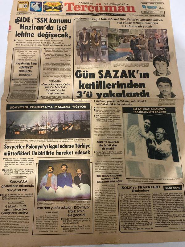 TERCÜMAN GAZETESİ - DOĞUM GÜNÜ HEDİYESİ (TURKISH NEWSPAPPER) - 8 NİSAN 1981 - SADECE TEK YAPRAKTIR -Cengiz Gül-Gün Sazak-Sadik Side-Nazlı Ilıcak-Ahmet Kabaklı-Mahmut Baler-Rauf Tamer-Ercüfün-Ahmet Emin Yalman-E Kurmay Albay Sadi Sarptır-M Malettin Akın-Şide SSK kanunu Haziranda işçi lehine değişecek-Gün Sazakin katillerinden 3ü yakalandı-Sovyetler Polonyaya malzeme yığıyor-Sovyetler Polonyayı işgal ederse Türkiye müttefikleri ile birlikte hareket edecek-Kosovadaki gösterilerin arkasında Sovyetler var-İrandan yurda sokulan 150 milyon liralık eroin ele geçirildi-Adana ve ilçelerinde 347 silah ele geçirildi-Eşi tatbikat sırasında katiller diye bağırdı-Beraat eden bir köylü İstiklal Mahkemesi hakimlerine Allah sizleri de kurtarsın dedi-Gün Işığında Ecurufun imrenilecek yaratık-Sözün Kısası Küçük Notlar-Yaşayan Türkçemiz Askeri edebiyat ve anı Türkçe-Lastiklerinizde belli bir havası vardır-Üçüncü şahıslara duyuru-Kara Kuvvetleri Komutanlığından duyuru-Manganes madeni aranıyor-Türkiyede ilk adlı eser Türkçe dilindedir.