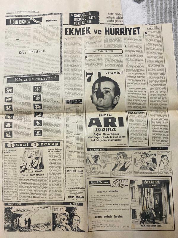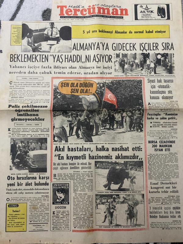 TERCÜMAN GAZETESİ - DOĞUM GÜNÜ HEDİYESİ (TURKISH NEWSPAPPER) - 9 HAZİRAN 1969 - SADECE TEK YAPRAKTIR -Ali Nail ERDEM-Mustafa Kart-Rauf Tamer-Şükrü Baban-Yalçın Kılınç-Almanya’ya Gidecek İşçiler Sıra Beklemekten Yaş Haddini Aşıyor-5 yıl sıra beklemeyi Almanlar da normal kabul etmiyor-Yabancı işçiye fazla ihtiyacı olan Almanya ise işçiyi nereden daha çabuk temin ederse oradan alıyor-Polis çekilmezse öğrenciler imtihana girmeyecekler-Oto hırsızlarına karşı yeni bir alet bulundu-Akil hastaları halka nasihat etti-En kıymetli hazinemiz aklımızdır-Siyasi hak tasarısı için otomatik kanunlaşma söz konusu olamıyor-Fevzioğlu Komünizm korku ve zulüm getirir-Bursa cezaevinde 200 mahkum isyan etti-Esnaf Dernekleri kongresi ani bir kararla tehir edildi-3 temizlik işçisi çöplükte buldukları beş bin lirayı Belediye Başkanına teslim etti-Ekmek ve Hürriyet-Görüşler Düşünceler Fikirler-Efes Festivali-Yıldızınız ne diyor-3 sual 3 cevap-Pipo ne derece zararsız-Saadet rüyası-Hafiyeler Kralı-Sözün kısası-Naza, Kemal ılıcak tarafından kaleme alınmıştır. TERCÜMAN GAZETESİ - DOĞUM GÜNÜ HEDİYESİ (TURKISH NEWSPAPPER) - 9 HAZİRAN 1969 - SADECE TEK YAPRAKTIR -Ali Nail ERDEM-Mustafa Kart-Rauf Tamer-Şükrü Baban-Yalçın Kılınç-Almanya’ya Gidecek İşçiler Sıra Beklemekten Yaş Haddini Aşıyor-5 yıl sıra beklemeyi Almanlar da normal kabul etmiyor-Yabancı işçiye fazla ihtiyacı olan Almanya ise işçiyi nereden daha çabuk temin ederse oradan alıyor-Polis çekilmezse öğrenciler imtihana girmeyecekler-Oto hırsızlarına karşı yeni bir alet bulundu-Akil hastaları halka nasihat etti-En kıymetli hazinemiz aklımızdır-Siyasi hak tasarısı için otomatik kanunlaşma söz konusu olamıyor-Fevzioğlu Komünizm korku ve zulüm getirir-Bursa cezaevinde 200 mahkum isyan etti-Esnaf Dernekleri kongresi ani bir kararla tehir edildi-3 temizlik işçisi çöplükte buldukları beş bin lirayı Belediye Başkanına teslim etti-Ekmek ve Hürriyet-Görüşler Düşünceler Fikirler-Efes Festivali-Yıldızınız ne diyor-3 sual 3 cevap-Pipo ne derece zararsız-Saadet rüyası-Hafiyeler Kralı-Sözün kısası-Naza adlı eser Türkçe dilindedir.