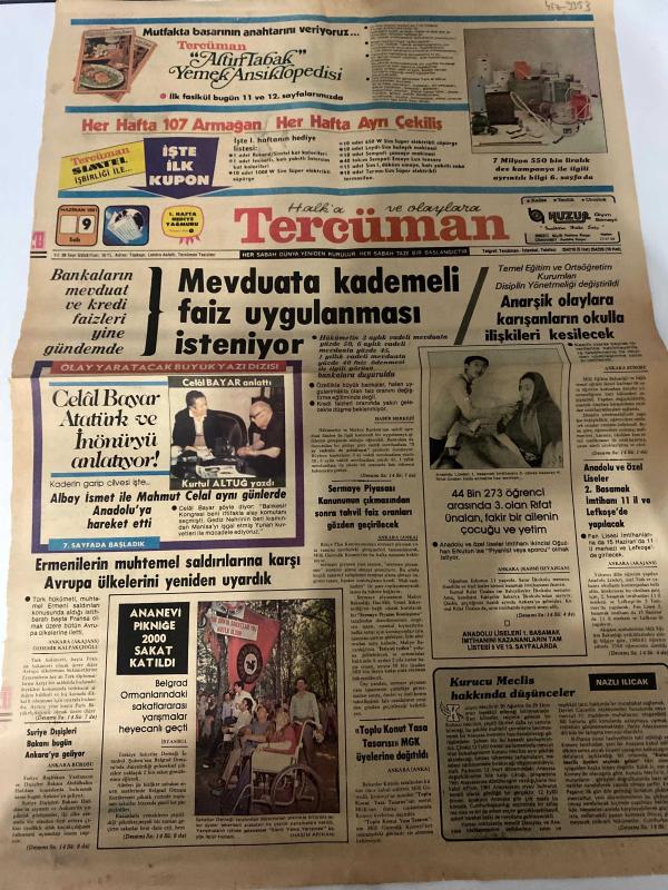 TERCÜMAN GAZETESİ - DOĞUM GÜNÜ HEDİYESİ (TURKISH NEWSPAPPER) - 9 HAZİRAN 1981 - SADECE TEK YAPRAKTIR -Celal Bayar-Kurtul ALTUG-Mahmut Celal-Prof Dr Süleyman Topçuoğlu-Prof Dr Cevat Babuna-Mehmet TİLEK-Op Dr Dündar Kalyoncu-Prof Dr Nevzat Gürbilek-Ahmet Kabaklı-Rauf Tamer-Mevduata kademeli faiz uygulanması isteniyor-Celal Bayar Atatürk ve İnönüyü anlatıyor-Albay İsmet ile Mahmut Celal aynı günlerde Anadoluya hareket etti-Ermenilerin muhtemel saldırılarına karşı Avrupa ülkelerini yeniden uyardık-Anarşik olaylara karışanların okulla ilişkileri kesilecek-44 Bin 273 öğrenci arasından 3 olan Rıfat Ünalın fakir bir ailenin çocuğu ve yetim-Bankaların mevduat ve kredi faizleri yine gündemde-Sermaye Piyasası Kanunun çıkmasından sonra tahvil faiz oranları gözden geçirilecek-Anadolu Liseleri 1 Basamak İmtihanını kazananların tam listesi 13 sayfalarda-Kurucu Meclis hakkında düşünceler-Gün Işığında-Kürtaj serbest bırakılmalı mı-İstanbul Müftüsü Selahattin Kaya-Güven duymak-Yasayan Türkçemiz-Üniversi adlı eser Türkçe dilindedir.
