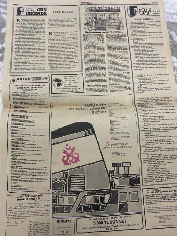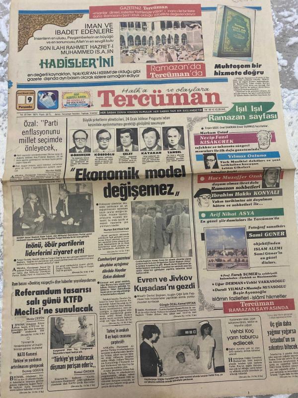 TERCÜMAN GAZETESİ - DOĞUM GÜNÜ HEDİYESİ (TURKISH NEWSPAPPER) - 9 HAZİRAN 1983 - SADECE TEK YAPRAKTIR -Turgut Özal-Kenan Evren-Necip Fazıl Kısakürek-Yılmaz Öztuna-Hacı Muzaffer Ozak-İbrahim Hakkı Konyalı-Arif Nihat Asya-Sami Güner-Prof Faruk Sümer-Uğur Derman-Vehbi Vakkasoğlu-Duralı Yılmaz-Mustafa Miyasoğlu-Beşir Ayvazoğlu-Ahmet Kabaklı-İlhan Bardakçı-Rauf Tamer-Zeynep Göküş-Nurten Bayraktar-Metin Çetin-Kemal Önder-Zeki Çelikkol-Nur Batur-Özal Parti enflasyonunu millet seçimde önleyecek-Ekonomik model değişemez-Referandum tasarısı salı günü KTFD Meclisine sunulacak-Evren ve Jivkov Kuşadasını gezdi-Türkiyeye saldıracak düşmanı perişan ederiz-Vehbi Koç yarın taburcu edilecek-Kırık dökük-Usulü haber-Galata saray penceresinden-Tatilinizin en güzel günleri bizimle-İman ve ibadet edenlere-Son ilahi rahmet Hazreti Muhammedin hadislerini-Muhteşem bir hizmete doğru-Işıl ışıl Ramazan sayfası-Yeni faizler tespit ediliyor-Elektrik kısıtlaması bugün başlıyor-Keban devre dışı kalabilir-Turizm Bankası, Kemal ılıcak tarafından kaleme alınmıştır. TERCÜMAN GAZETESİ - DOĞUM GÜNÜ HEDİYESİ (TURKISH NEWSPAPPER) - 9 HAZİRAN 1983 - SADECE TEK YAPRAKTIR -Turgut Özal-Kenan Evren-Necip Fazıl Kısakürek-Yılmaz Öztuna-Hacı Muzaffer Ozak-İbrahim Hakkı Konyalı-Arif Nihat Asya-Sami Güner-Prof Faruk Sümer-Uğur Derman-Vehbi Vakkasoğlu-Duralı Yılmaz-Mustafa Miyasoğlu-Beşir Ayvazoğlu-Ahmet Kabaklı-İlhan Bardakçı-Rauf Tamer-Zeynep Göküş-Nurten Bayraktar-Metin Çetin-Kemal Önder-Zeki Çelikkol-Nur Batur-Özal Parti enflasyonunu millet seçimde önleyecek-Ekonomik model değişemez-Referandum tasarısı salı günü KTFD Meclisine sunulacak-Evren ve Jivkov Kuşadasını gezdi-Türkiyeye saldıracak düşmanı perişan ederiz-Vehbi Koç yarın taburcu edilecek-Kırık dökük-Usulü haber-Galata saray penceresinden-Tatilinizin en güzel günleri bizimle-İman ve ibadet edenlere-Son ilahi rahmet Hazreti Muhammedin hadislerini-Muhteşem bir hizmete doğru-Işıl ışıl Ramazan sayfası-Yeni faizler tespit ediliyor-Elektrik kısıtlaması bugün başlıyor-Keban devre dışı kalabilir-Turizm Bankası adlı eser Türkçe dilindedir.
