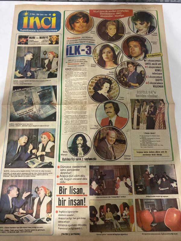 TERCÜMAN GAZETESİ İNCİ İLAVESİ DOĞUM GÜNÜ HEDİYESİ - 23 MART 1984 - 4 SAYFADIR -Emel Sayın-Zeki Müren-Ajda Pekkan-Türkan Şoray-Bedia Akartürk-Yıldız Kenter-Nuri Sesigüzel-Cüneyt Gökçer-Barış Manço-Nuri ile Nuriye-Leman Akıman-Kartal Tibet-Aka Gündüz-Pearl S. Buck-Birsen Emgen-Nevin Gülün-Cüneyt Gökçer-Nesrin Baltaş-Dr. Kimran Şenel-Fatoş-Berna Tunalı-Günhan Kurt-Diana Dors-Tanrım gözlerimi geri ver-İlk 3-Bir lisan bir insan-Sevmek mi yaşamak mı-İki aşk arasında-Dikkat başarı hırsı sizi güzellikten düşürebilir-Greyfurt vücudun direncini artırıyor-Tahta kaşıklar yemeklerin lezzetini artırır-Çelik tenceredeki minik lekeler-Sözün özü-Ergenlik sivilceleri gençlerin çoğunun derdidir-Dikmen Yıldızı-Sağlığımız ve biz-Peklik derdi-Üç soru üç cevap-Kalp hastalığı öksürük yapar mı-İçimizdeki satırlar-Arzum-Mehmetçik-Fatoş’la başbaşa-Boşanmak istiyorum-O pastele küstüm-Tanrım gözlerimi geri ver-Okyanusta gömülen ümitler-Ağaç sanatının son fidanı Günhan Kurt-Diana Dors kanseri yendi adlı eser Türkçe dilindedir. Eserin içeriğinde Türkçe dilinde bölümlere de yer verilmektedir.