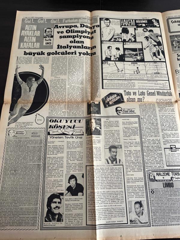 TERCÜMAN GAZETESİ İNCİ SPOR İLAVESİ - 3 MAYIS 1973-Necmi Tanyolaç-Tevfik Ünsi-Ergun Hiçyılmaz-İslam Çupi-Necati Bilgiç-Hayri Hiçler-Eyüp Karadayı-galatasaray-Fenerbahçe-lig şampiyonluğu-Türkiye kupası-Türkiye liginde şampiyon-Avrupa-riva-Toto ve loto Genel müdürlük-Ahmet Şahin-hasköy’ün derdi-Sakaryaspor-Çerkezköy esnaf Spor-Lüleburgaz Spor-Süleyman Ercan-Orhan kapçak-Bolu kız Öğretmen okulu-İstanbul kız Lisesi-Gaziantep sağlık koleji-Elazığ kız enstitüsü-Bursa Bursaspor-Uludağ’da Kulis- yabancı antrenör brian birch -Selver Şengün-Eyüp karadayı-seyircisi Almanya’da toplanacak-npr ya-gruplarda durum-Juventus adlı eser, Kitap > Süreli Yayınlar > Gazeteler > Türkiye > Genel > Günlük kategorisinde İkinci El olarak satıştadır.