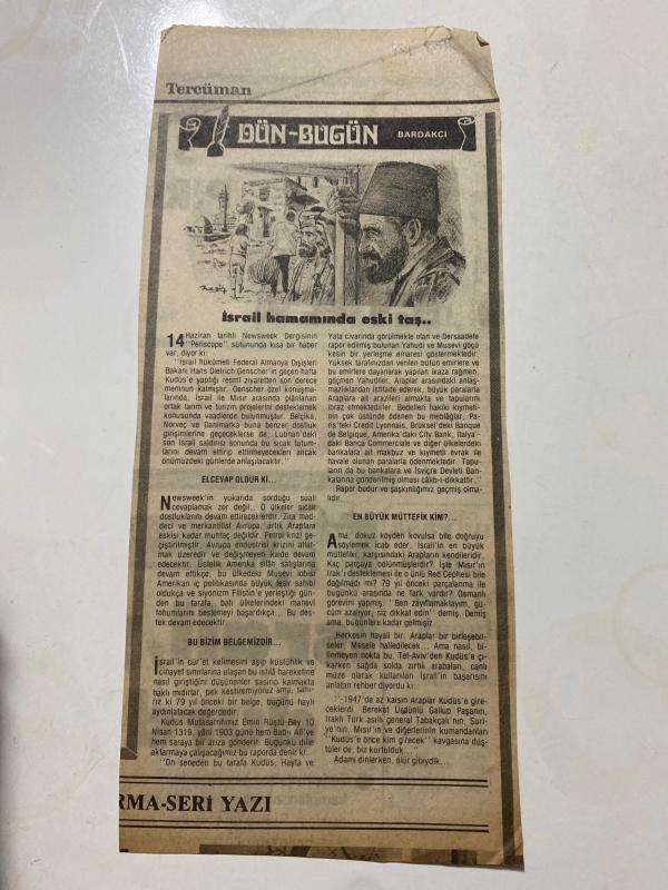 TERCÜMAN GAZETESİ KUPÜRÜ 30 x 13 cm ebatında Tek Yaprak 1980LER - TARİHTEN BUGÜNE İLHAN BARDAKÇI KÖŞE YAZISI -Bardakçı-Hans Dietrich Genscher-Emin Rüştü Bey-Gallup Paşa-İsrail hamamında eski tas-En büyük müttefik kim-Bu bizim belgemizdir-Sedat Sertoglu-İsrail durduruldu adlı eser, Kitap > Süreli Yayınlar > Gazeteler > Türkiye > Genel > Günlük kategorisinde İkinci El olarak satıştadır.