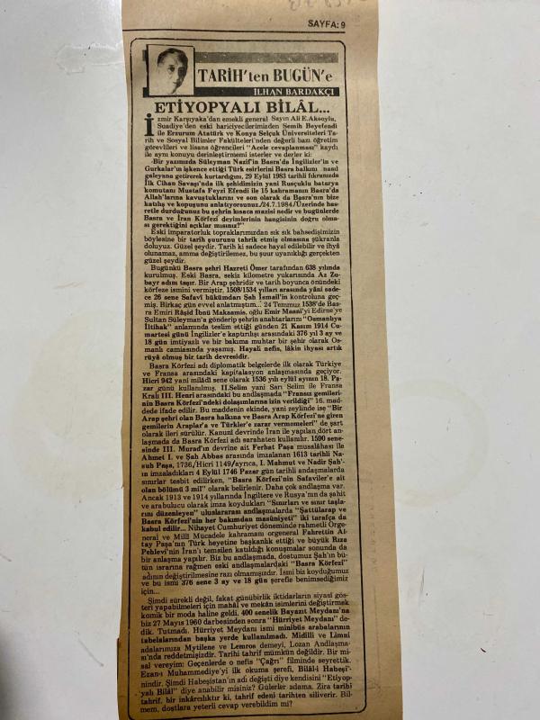 TERCÜMAN GAZETESİ KUPÜRÜ 32 x 12 cm ebatında Tek Yaprak 1980LER - TARİHTEN BUGÜNE İLHAN BARDAKÇI KÖŞE YAZISI -TARİH’ten BUGÜN’e - ETİYOPYALI BİLÂL... - İLHAN BARDAKÇI - Ali E. Aksoylu - Semih Beyefendi - Süleyman Nazif - Mustafa Feyzi Efendi - Hazreti Ömer - Şah İsmail - Emir Maa’ni - Sultan Süleyman - Kanuni - III. Murad - Ferhat Paşa - Ahmet I. - Şah Abbas - I. Mahmut - Nadir Şah - Fahrettin Altay Paşa - Rıza Pehlevi - Bilal-i Habeşi - MAAŞ ANARŞİSİ - MEMUR FAKİRLEŞİYOR - Ahmet Beyaslan - Kenan Evren - Necmettin Karaduman - Turgut Özal adlı eser Türkçe dilindedir.