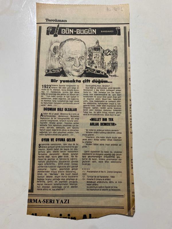 TERCÜMAN GAZETESİ KUPÜRÜ 33 x 13 cm ebatında Tek Yaprak 1980LER - TARİHTEN BUGÜNE İLHAN BARDAKÇI KÖŞE YAZISI -Bardakçı-Bir yumakta çift düğüm-Millet bir tek ahlak demektir-Düşman bile olsalar-Oyun ve oyuna gelen-Kur’an-ı Kerim-Cüz-Cüz Kerim-Ansiklopedik İslam Lügati-Bazı bankaların teminat mektupları adlı eser Türkçe dilindedir.