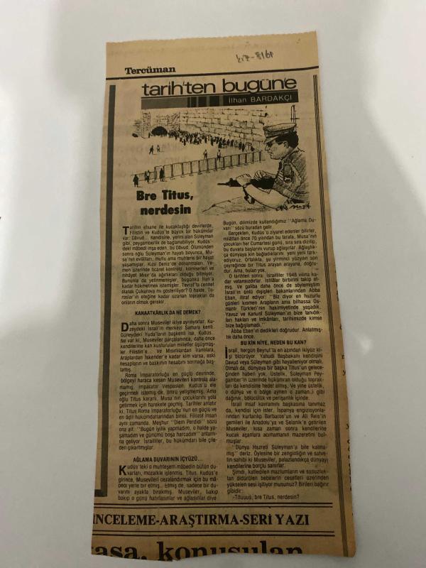 TERCÜMAN GAZETESİ KUPÜRÜ 33 x 13 cm ebatında Tek Yaprak 1980LER - TARİHTEN BUGÜNE İLHAN BARDAKÇI KÖŞE YAZISI -İlhan Bardakçı-Titus-Musa-Süleyman-Abba Eban-Fatih-Yavuz-Tituus-Turgut Özal-Bre Titus, nerdesin-İlk Ermeni Terör Belgesi-KANAATKÂRLIK DA NE DEMEK-AĞLAMA DUVARININ İÇYÜZÜ-ÖZAL’ın kredibilitesi sarsmamalı-Halk’a Tercüman-Tercüman adlı eser Türkçe dilindedir.