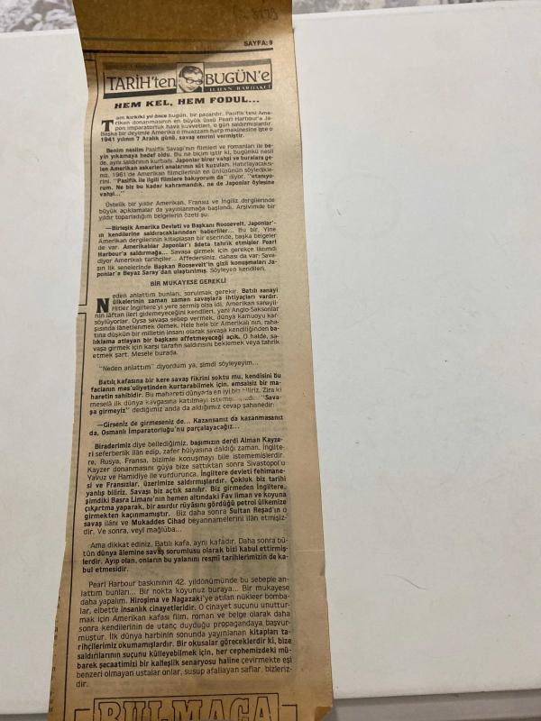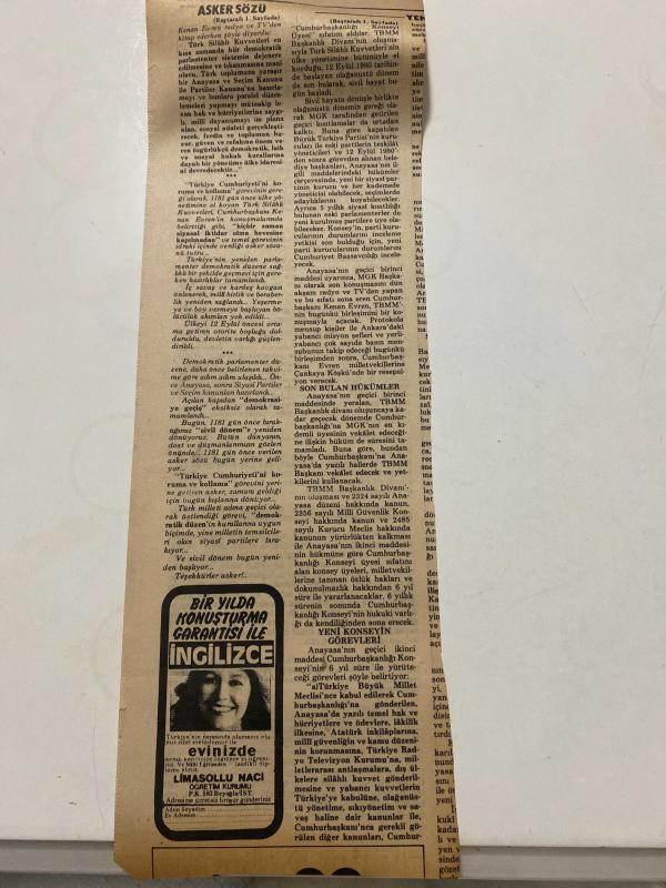 TERCÜMAN GAZETESİ KUPÜRÜ 35 x 11 cm ebatında Tek Yaprak 1980LER - TARİHTEN BUGÜNE İLHAN BARDAKÇI KÖŞE YAZISI-ASKER SÖZÜ-Kenan Evren-LİMASOLLU NACİ-TARİH'ten BUGÜN'e-İLHAN BARDAKCI-HEM KEL, HEM FODUL...-BİR MUKAYESE GEREKLİ-Pearl Harbour-Roosevelt-Hitler-Kayzer-Sultan Reşad-BİR YILDA KONUŞTURMA GARANTİSİ İLE İNGİLİZCE adlı eser Türkçe dilindedir.