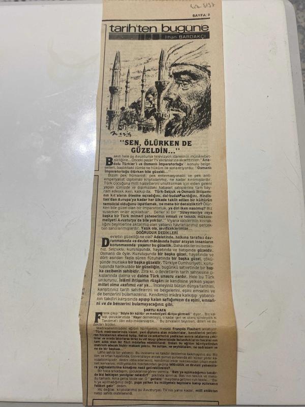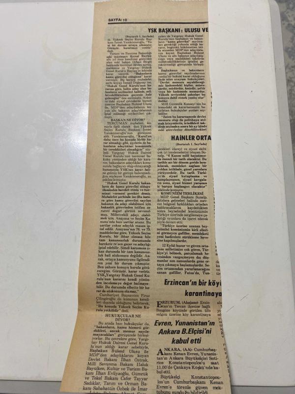 TERCÜMAN GAZETESİ KUPÜRÜ 35 x 11 cm ebatında Tek Yaprak 1980LER - TARİHTEN BUGÜNE İLHAN BARDAKÇI KÖŞE YAZISI -İlhan Bardakçı-Yüksek Seçim Kurulu Başkanı İsmet Yankımeroğlu-Bülent Ulusu-Fırat Çilingiroğlu-Kenan Evren-Sotirios Konstantopoulos-tarihten bugüne-SEN ÖLÜRKEN DE GÜZELDİN-DOĞRUSU DEDİKLERİ-ŞARTLI KAFA-YSK BAŞKANI ULUSU VE-HAİNLER ORTADA-KOMÜNİZM TEHLİKESİ-Erzincan’ın bir köyü karantinaya-Evren Yunanistan’ın Ankara B.Elçisi’ni kabul etti adlı eser Türkçe dilindedir.