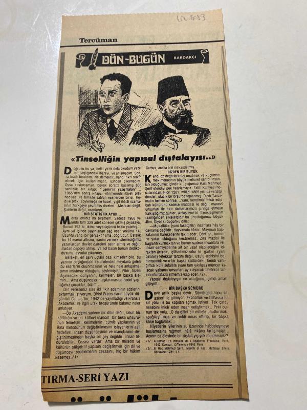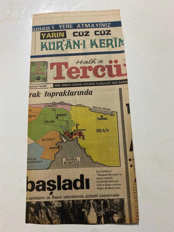 TERCÜMAN GAZETESİ KUPÜRÜ 35 x 13 cm ebatında Tek Yaprak 1980LER - TARİHTEN BUGÜNE İLHAN BARDAKÇI KÖŞE YAZISI -Bardakçı-Lenin-Camus-Hoca Mahmud Şerif-Tinselliğin yapısal dıştalayışı-Bizden bir büyük-Bir başka sömürü-Yarın cüz cüz Kur’an-İran Irak Basra Körfezi çatışmaları başladı adlı eser Türkçe dilindedir.