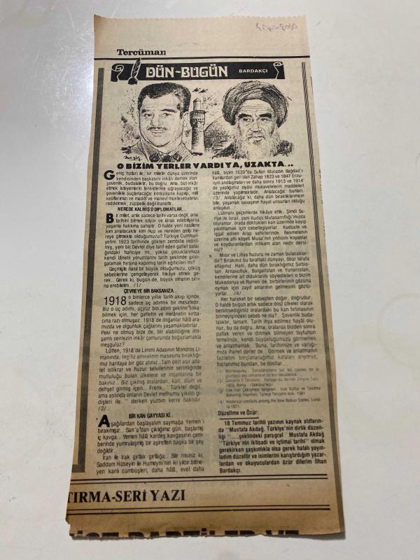 TERCÜMAN GAZETESİ KUPÜRÜ 35 x 13 cm ebatında Tek Yaprak 1980LER - TARİHTEN BUGÜNE İLHAN BARDAKÇI KÖŞE YAZISI -Bardakçı-Saddam Hüseyin-Humeyni-Bizim yerler var uzakta-Nerede kalmış diplomatlar-Çevreye bir baksanıza-Bir kan gayyası ki-Anayasa Komisyonu-Aldıkaçtı hasret gideriyor-Türk-İş adlı eser Türkçe dilindedir.