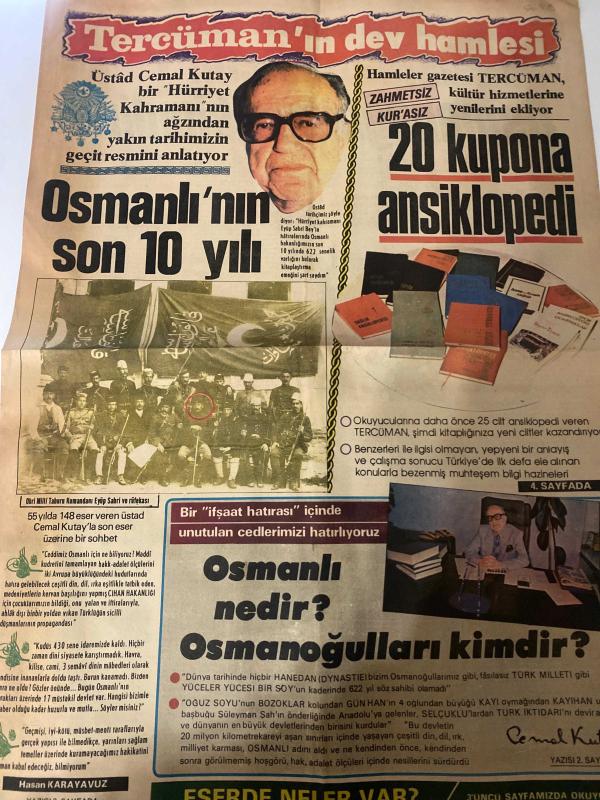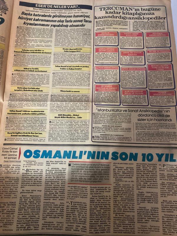 TERCÜMAN GAZETESİ - SADECE 4 SAYFADIR -Cemal Kutay-Eyüp Sabri-Tarık Buğra-Hasan Karayavuz-Selçuk Aybar-Osmanlı’nın son 10 yılı-Osmanlı nedir? Osmanoğulları kimdir?-Doktora gitmeden önce-Tercüman kadın ansiklopedisi-20 kupona ansiklopedi-Bir ifşaat hatırası içinde unutulan cedlerimizi hatırlıyoruz-Eserde neler var?-Tercüman’ın bugüne kadar kitaplığınıza kazandırdığı ansiklopediler-Üstad Cemal Kutay bir Hürriyet Kahramanı’nın ağzından yakın tarihimizin geçit resmini anlatıyor