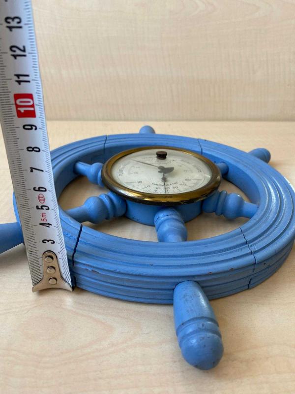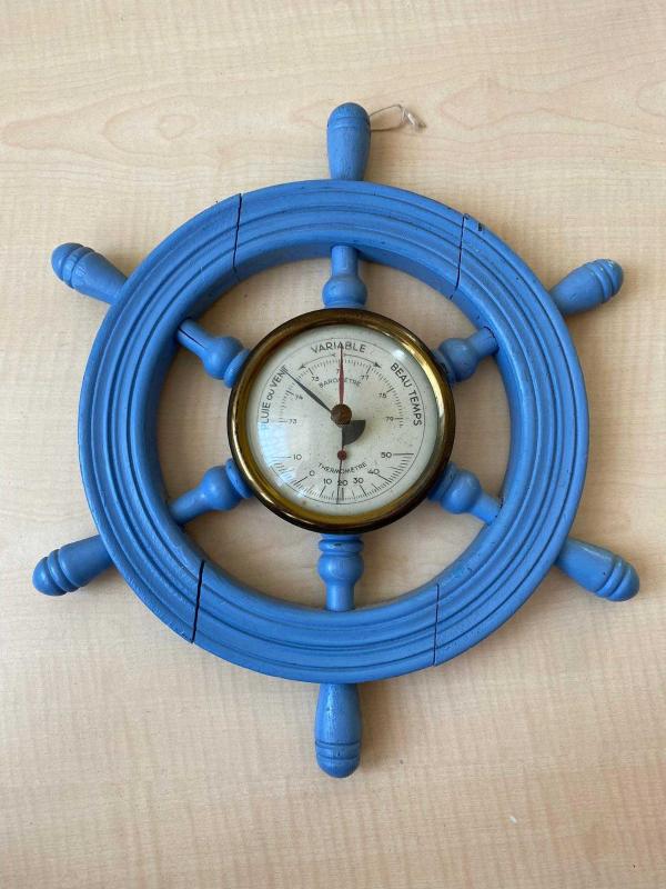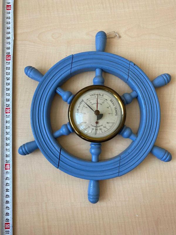 TERMOMETRE VE BAROMETRE AHŞAP GEMİ DÜMENİ ŞEKİNDE BAROMETRE başlıklı antika/koleksiyon objesi Avrupa menşe’lidir. 1960-1979 arası dönemine aittir.
