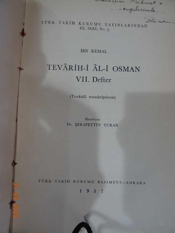 TEVARİH-İ AL'İ OSMAN - VII. DEFTER (TENKİDLİ TRANSKRİPSİYON) (Haz. ŞERAFETTİN TURAN tarafından İMZALI), İBN KEMAL tarafından kaleme alınmıştır. Eser ŞERAFETTİN TURAN editörlüğünde hazırlanmıştır. Kitap 1957 yılında TÜRK TARİH KURUMU tarafından [ANKARA] yayınlanmıştır. TEVARİH-İ AL'İ OSMAN - VII. DEFTER (TENKİDLİ TRANSKRİPSİYON) (Haz. ŞERAFETTİN TURAN tarafından İMZALI) adlı eser Türkçe dilindedir.