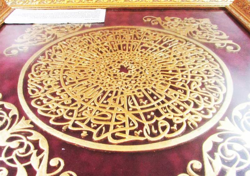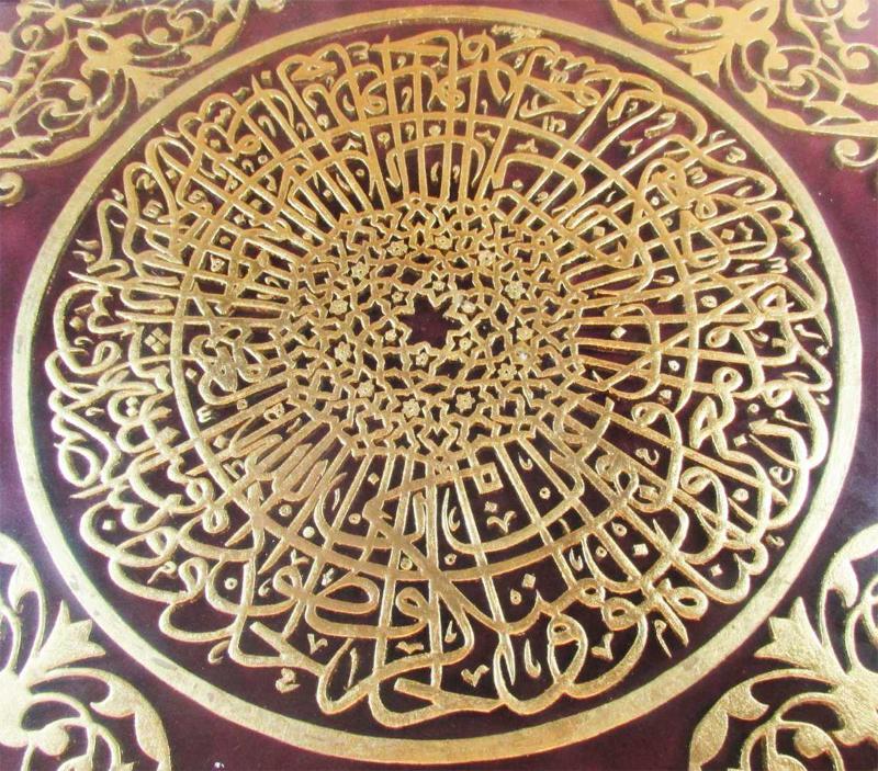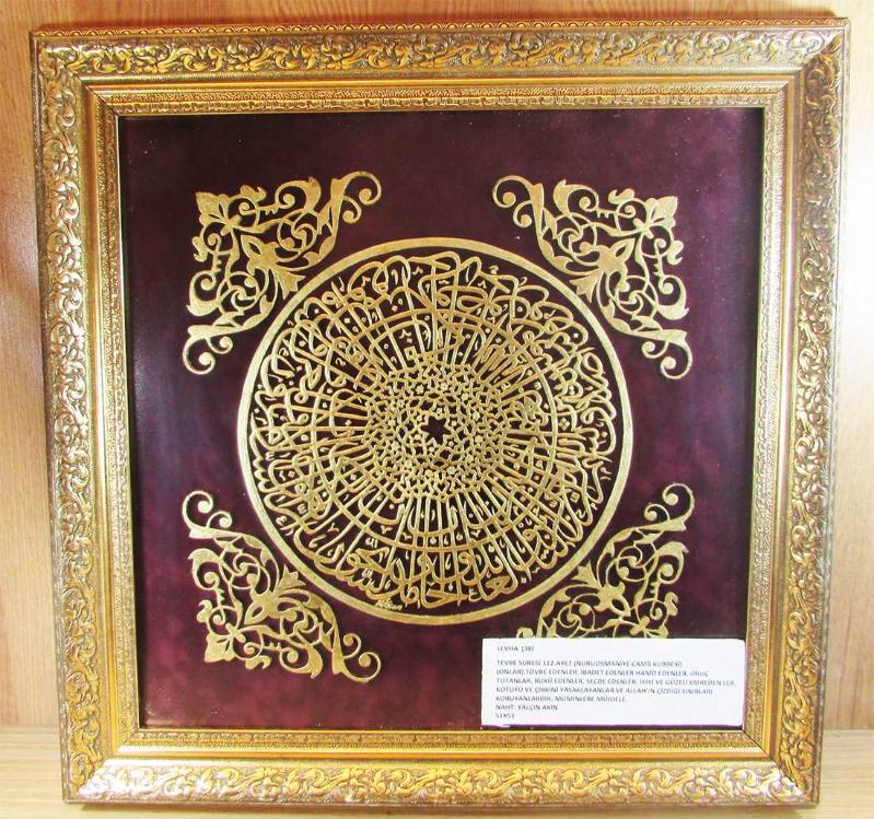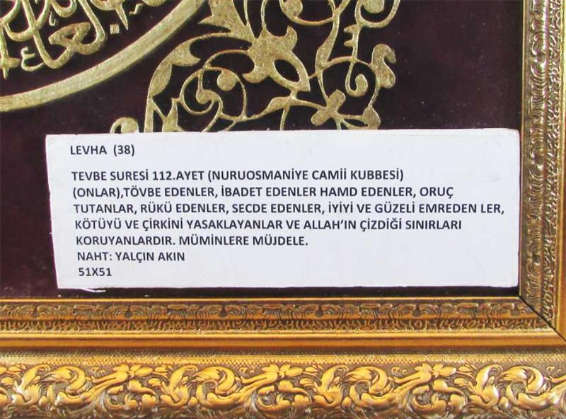 NAHHAT "Yalçın Akın" TARAFINDAN NAHT SANAT İLE YAPILMIŞ, ÜZERİ ALTIN VARAKLI,TEVBE SURESİ 112.AYETİ HAT TABLO, TERTEMİZ VARAKLI AHŞAP ÇERÇERÇEVELİ VE CAMLI, ESERİN DETAYI,CAMINA YAPIŞIK KAĞIT ÜZERİNDE YAZILIDIR, ÇERÇEVELİ ÖLÇÜ 51cmx51cm