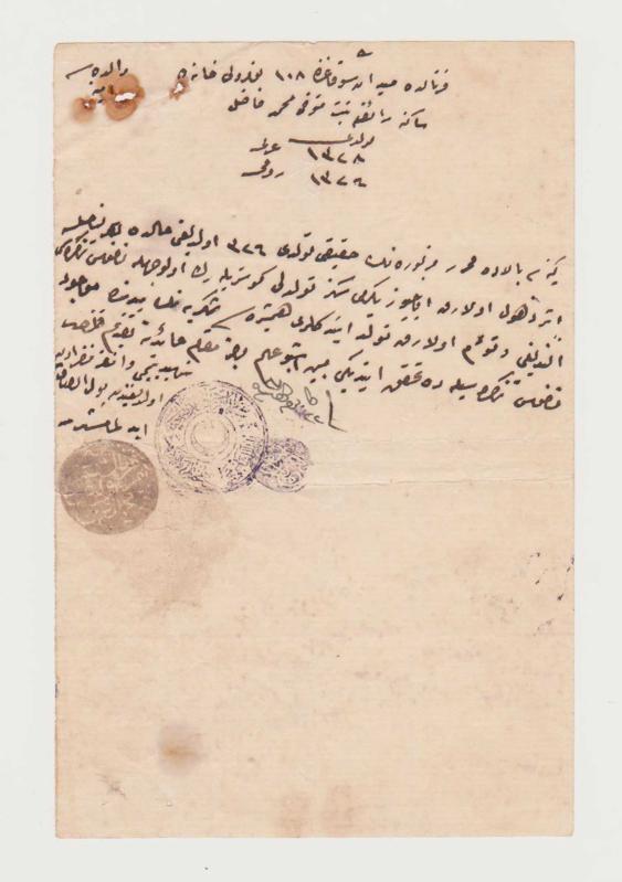 Orijinal osmanlıca el yazılı belge. 1 sayfa. Osmanlı dönemi sosyal tarih. 20x13 cm. Kartal'da Meydan Sokağı 108 numaralı hane sakini … mevki-i Mehmed Fazıl. İmzalı ve mühürlü. -- Osmanlı kültürü Osmanlı bürokrasisi Erken dönem Cumhuriyet Nüfus Bürokrasi.
