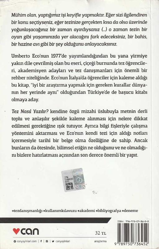 TEZ NASIL YAZILIR ?, UMBERTO ECO tarafından kaleme alınmıştır. Kitap 2020 yılında CAN YAYINLARI tarafından [İSTANBUL] yayınlanmıştır. Bu baskının çevirisi BETÜL PARLAK tarafından yapılmıştır. 318 sayfadır. TEZ NASIL YAZILIR ? adlı eser Türkçe dilindedir.