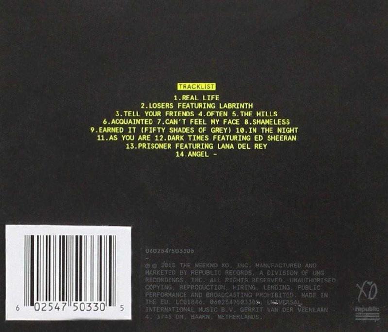 1 Real Life 3:43 2 Losers 4:41 3 Tell Your Friends 5:34 4 Often 4:09 5 The Hills 4:02 6 Acquainted 5:48 7 Can't Feel My Face 3:33 8 Shameless 4:13 9 Earned It (Fifty Shades Of Grey) 4:37 10 In The Night 3:55 11 As You Are 5:40 12 Dark Times 4:20 13 Prisoner 4:34 14 Angel 6:17 2015 CD AMBALAJINDADIR KARGO SÜRESİ EN AZ İKİ HAFTADIR