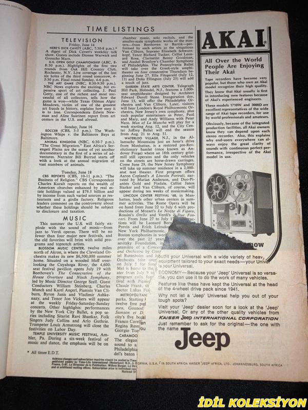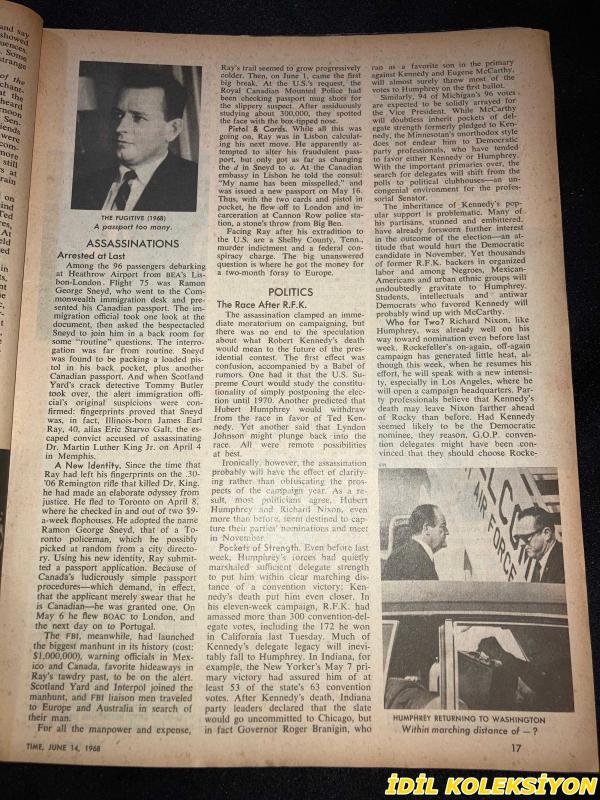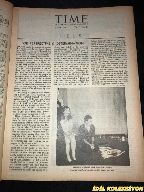 TIME - JUNE 14 , 1968 : THE WEEKLY NEWSMAGAZINE / 14 HAZİRAN 1968 / VINTAGE ENGLISH MAGAZINE / ROBERT KENNEDY / JEEP / KENNEDY WORKERS NEAR SHOOTING SCENE / 27 MINUTES ON JUNE 5-1968 A LIFE ON THE WAY TO DEATH / ROSE KENNEDY / KENNEDY CHILDREN AT ST. PATRICK'S REQUIEM / LEE RADZIWILL , RALPH ABERNATHY & JACKIE KENNEDY AT BIER / POLITICS & ASSASINATION / THE FUGITIVE 1968 / USS UNITED STATES STEEL INTERNATIONAL / NORTH VIET NAM'S TEAM : BO , THO & THUY / RANDOLPH CHURCHILL / WINNER VELASCO / ROLEX / DR. BAZILAUSKAS / CAMPARI / SAN FRANCISCO'S NATHAN HARE / FIAT / SCOTT & CHRISTIE / WESSELMANN EXHIBIT IN CHICAGO / OLITSKI'S CLOUDS OF MOONGLOW / AIR FRANCE CARGO / KENT (İLK SAYFASINDA KÜÇÜK BİR YIRTILMA MEVCUT)