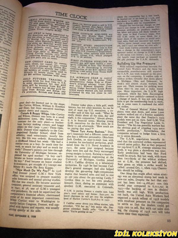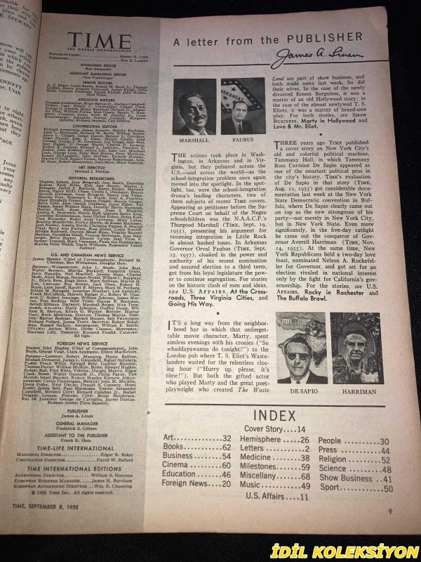 TIME - SEPTEMBER 8 , 1958 : THE WEEKLY NEWSMAGAZINE / 8 EYLÜL 1958 / VINTAGE ENGLISH MAGAZINE / MILTON EISENHOWER / JAMES R. GILLESPIE / A.S. PERKINS / MRS. JAMES R. BELHASSEN / MARION SMITH / WILLIAM HALLIS / DONALD JOHN GIESE / ED KOLPACK / RENAULT / DIANE QUITTENTON / EDNA WEXLER / SYBIL KLIMAN / JOSEPH HALPIN / MARSHALL / FAUBUS / DE SAPIO / HARRIMAN / LAWYERS RANKIN & BUTLER / PRESIDENT EISENHOWER / CHIEF JUSTICE WARREN / FEDERAL JUDGE LEMLEY / GOVERNOR ALMOND / A.B.A. PRESIDENT MALONE / IKE & MILTON / ADMIRAL BEAKLEY / MILTON EISENHOWER & DAUGHTER RUTH / REPUBLICANS ROCKEFELLER & KEATING / TAMMANY'S DE SAPIO / CHIANG KAI-SHEK & FROGMEN / GIAMBATTISTA GIUFFRE / DELEGATE BERNARDINO / ANGLER NORSTAD / SOPRANO GARDEN / HASSELBLAD / BALLANTINES / ERNEST & RHODA BORGNINE / THOMAS & VALERIE ELIOT / EDITOR CLEMENTS / HARVEY'S / PHYSICIST LAWRENCE / ENGLAND'S VAUGHAN WILLIAMS / OLYMPIA'S BISHOP BAYNE / FRED LAZARUS / DEFENSE PROCUREMENT : TRENCH-WAR POLİCİES İN THE SPACE AGE / T. HANBURY