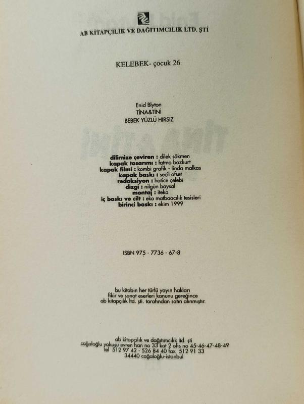 TİNA & TİNİ / BEBEK YÜZLÜ HIRSIZ, Enid Blyton tarafından kaleme alınmıştır. Kitap 1999 yılında Kelebek Çocuk tarafından [İstanbul ] 975-7736-67-8 ISBN kodu ile yayınlanmıştır. Satışta olan kitap, yayınevinin 1. baskısıdır. Bu baskının çevirisi Dilek Sökmen tarafından yapılmıştır. 144 sayfadır. TİNA & TİNİ / BEBEK YÜZLÜ HIRSIZ adlı eser Türkçe dilindedir. Eserin içeriğinde Türkçe dilinde bölümlere de yer verilmektedir.