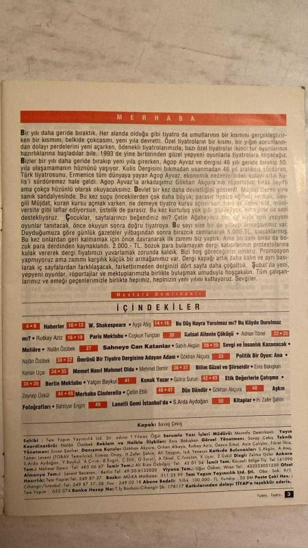 TİYATRO AYLIK HABER TANITIM DERGİSİ - OCAK 1993 SAYI: 22 MUSTAFA DEMİRKANLI - AYŞE ATEŞ - COŞKUN TUNÇTAN - ADNAN TÖNEL - RUTKAY AZİZ - MOLIÈRE - NALAN ÖZÜBEK - SABİH AKGÜN - GÖKHAN AKÇURA - ENİS BAKIŞKAN - KENAN UÇAR - MEHMET DEMİR - GÜLRİZ SURURİ - YALÇIN BAYKUL - ZEYNEP ÜSKÜL - ÇETİN ETİLİ - H. ZAFER ŞAHİN - S. ARDA AYDOĞAN - BAHTİYAR ENGİN - SAVAŞ ÇEKİÇ - SİNAN ŞANLIER - ORHAN ALKAYA - GENCO ERKAL - AZİZ ÇALIŞLAR - FİKRET İLKİZ - TAMER LEVENT - YILMAZ ONAY - ALİ TAYGUN - IŞIK YENERSU MERHABA - HABERLER - W. SHAKESPEARE - BU DÜŞ HAYRA YORULMAZ MI? - BU KÖYDE DURULMAZ - PARİS MEKTUBU - KUTSAL AİLENİN ÇÖKÜŞÜ - SAHNEYE CAN KATANLAR - SEVGİ VE İNSANLIK KAZANACAK: ANA - ÖMRÜNÜ BİR TİYATRO DERGİSİNE ADAYAN ADAM - BİLİM GÜZEL VE ŞİİRSEL - MEMET NASIL MEHMET OLDU - KONUK YAZAR: GÜLRİZ SURURİ - ETİK DEĞERLERLE ÇATIŞMA - BERLİN MEKTUBU - DÜN DÜNDÜR - AŞKIN - MERHABA CINDERELLA - KİTAPLAR - LANETLİ GEMİ İSTANBUL’DA - TAM TAKIM EKSİKSİZ 50 SAYFA adlı eser, Kitap > Süreli Yayınlar > Dergiler > Otomobil kategorisinde İkinci El olarak satıştadır.