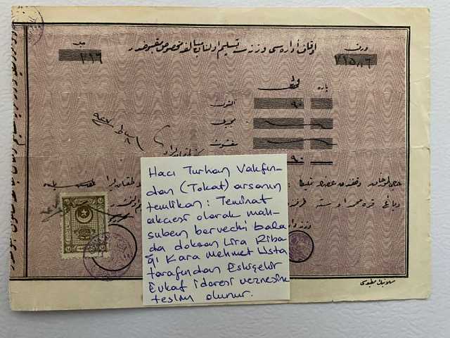 Tokat Hacı Turhan Vakfı'ndan arsanın temlikan makbuzu Eskişehir Efkaf Dairesi Veznesi'ne teslim olunmuştur. Çeviri: Bilge Çevikkan