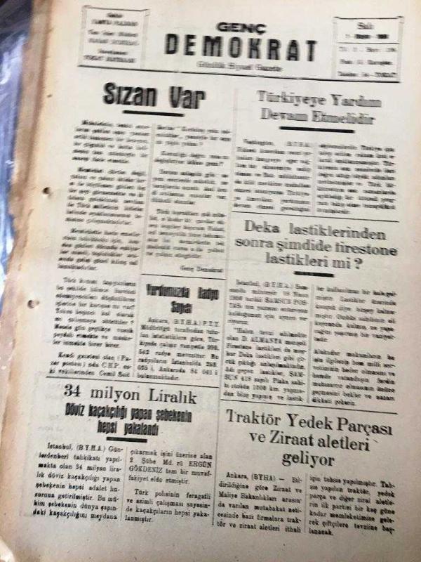 TOKAT GENÇ DEMOKRAT SİYASİ GAZETE- YEREL TAŞRA BASINI- 1 Mayıs 1956- YIL :2 SAYI :195- Sızan Var - Yurdumuzda Radyo Sayısı-34 milyon liralık döviz kaçakçılığı yapan şebekenin hepsi yakalandı - Türkiye ye Yardım Devam Etmelidir - Deka lastiklerinden sonra şimdi de firestone lastikleri mi ? Traktör Yedek Parçası ve Ziraat Aletleri Geliyor -Tokat Öğretmen Okuluna Parasız , Yatılı Öğrenci Alınacaktır - Yıpranma, sararmalar, kupon kesiği ve yırtılmalar zamana bağlı olarak görülebilir.