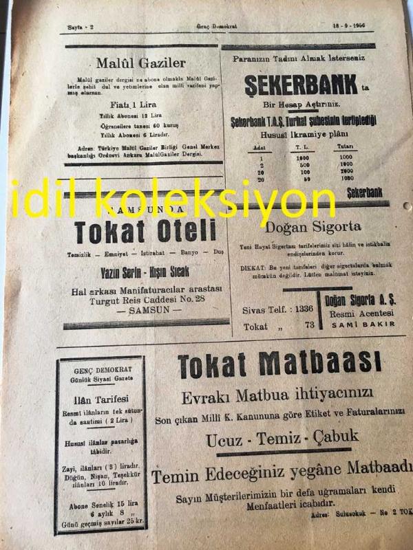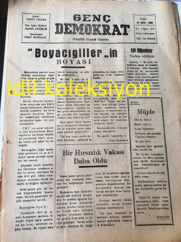 TOKAT GENÇ DEMOKRAT SİYASİ GAZETE- YEREL TAŞRA BASINI- ----18 Eylül 1956 Yıl :2 Sayı :308--Boyacıgiller 'in Boyası --Bir Hırsızlık Vakası Daha Oldu --934 Doğumlular Terhis Ediliyor - Yıpranma, sararmalar, kupon kesiği ve yırtılmalar zamana bağlı olarak görülebilir.