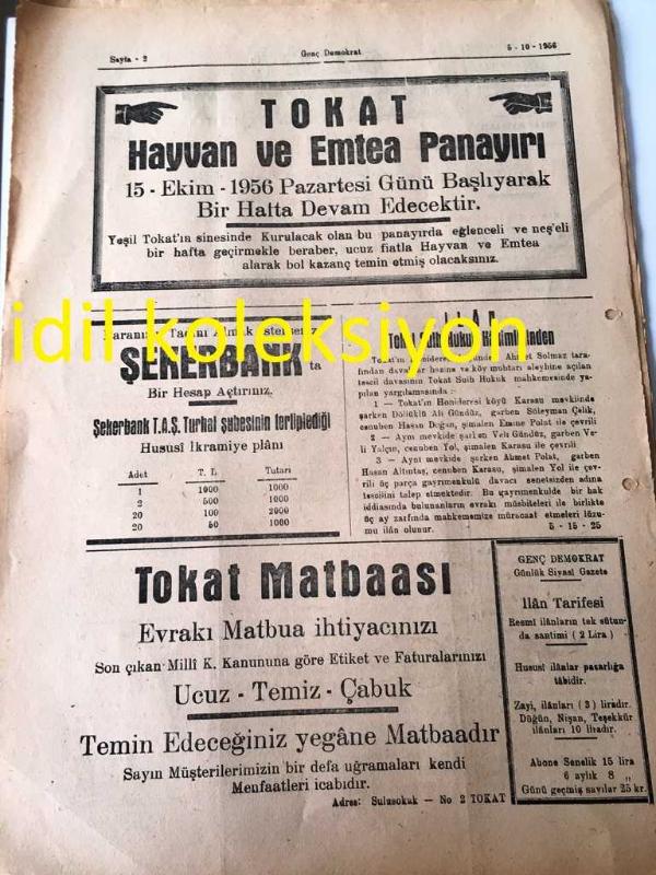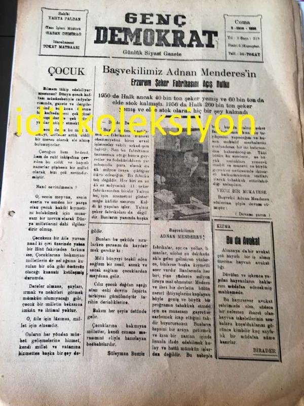 TOKAT GENÇ DEMOKRAT SİYASİ GAZETE- YEREL TAŞRA BASINI- ---5 Ekim 1956 Yıl :2 Sayı :318--Çocuk --Başvekilimiz Adnan Menderes 'in Erzurum Şeker Fabrikasını Açış Nutku --İlan Tokat Sulh Hukuk Hakimliğinden -- Yıpranma, sararmalar, kupon kesiği ve yırtılmalar zamana bağlı olarak görülebilir.