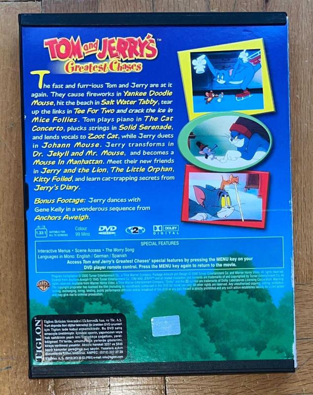 TOM AND JERRRY'S GREATEST CHASES * TOM VE JERRY 14 ÇİZGİ FİLM * SNAPCASE DVD TIGLON İTHALİ İKİNCİ EL, YOĞUN ÇİZİKLER VAR ANCAK SORUNSUZ ÇALIŞIYOR. DİL: İNGİLİZCE / DİYALOG YOKTUR. 99 DAKİKA WB / TİGLON