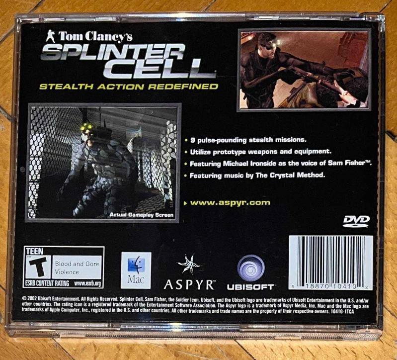 TOM CLANCY'S SPLINTER CELL * MAC OYUNU * CD-ROM * 2002 başlıklı antika/koleksiyon objesinin menşei belirtilmemiştir. Objenin ait olduğu dönem bilinmeketedir.
