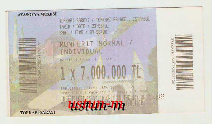 ** TOPKAPI SARAYI MÜNFERİT NORMAL BİLET ** Çok temiz durumda,2001 senesinden Topkapı Sarayı için münferit normal bilettir...