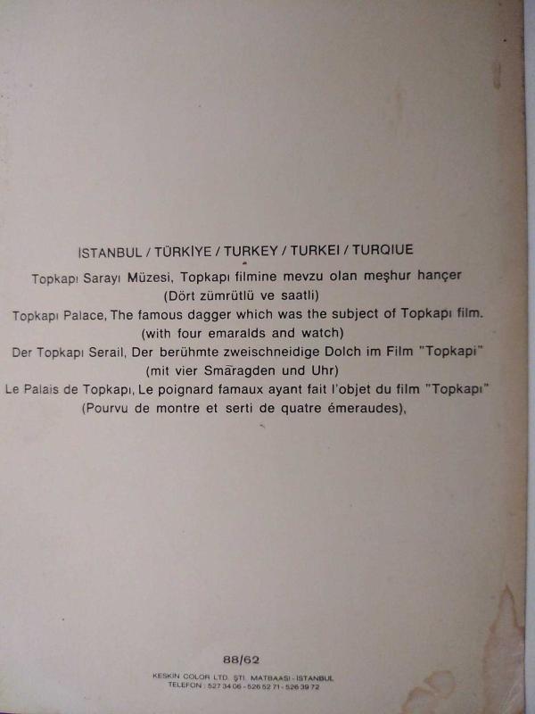 TOPKAPI SARAYINDAN DÖRT ZÜMRÜTLÜ VE SAATLİ HANÇER KARTPOSTALI,İÇ KISMINA YAZILMIŞ,KAPAKLI,RENKLİ, 11 X 15 CM EBADINDA, 1 yıl önce satışa sunulmuştur.