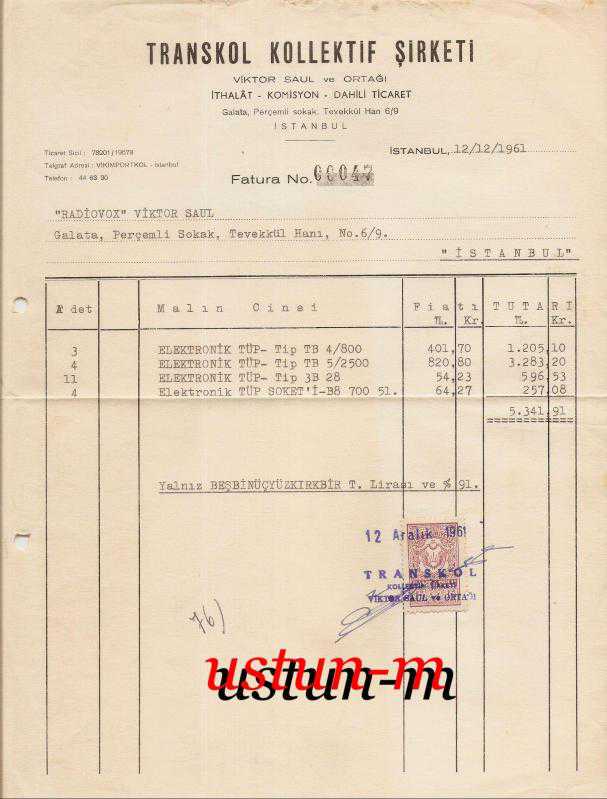 ** TRANSKOL KOLLEKTİF ŞİRKETİ / VİKTOR SAUL VE ORTAĞI ** 12 Aralık 1961 tarihli,çok temiz durumda, tek damga pullu,elektronik tüp temalı orijinal fatura...
