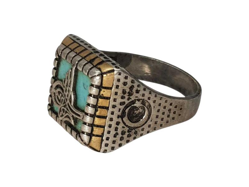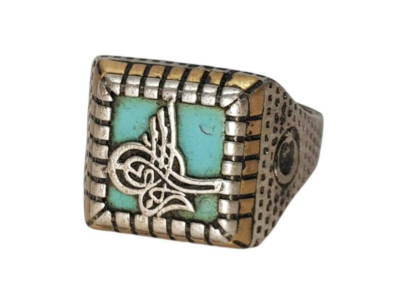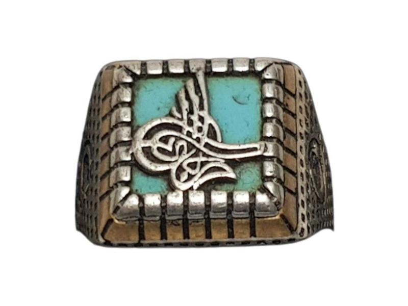 TUĞRA VE AY YILDIZLI GÜMÜŞ YÜZÜK başlıklı antika/koleksiyon objesi Türkiye menşe’lidir. 1980-1999 arası dönemine aittir.