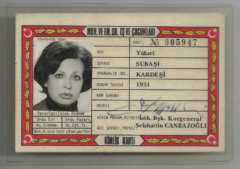 ** TÜMGENERAL EŞ VE ÇOCUKLARI ADINA ASKERİ KİMLİK KARTI ** Kartvizit boyutunda biraz daha büyükcene,fotoğraflı ve damgalı, arka yüzünde de bilgileri bulunan,naylon korumasında kimlik kartıdır...